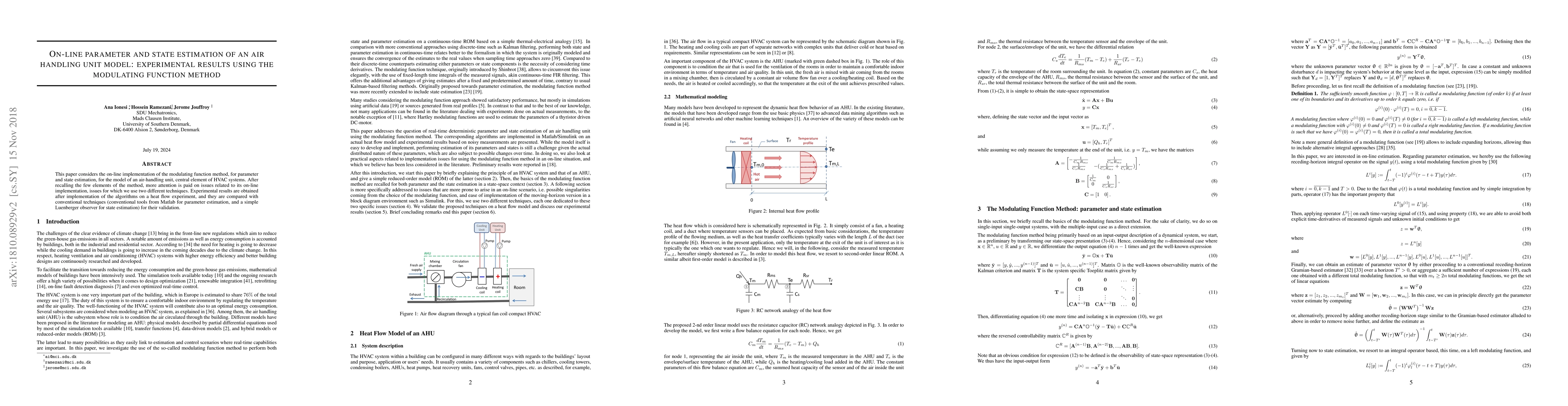 This paper considers the on-line implementation of the modulating function method, for parameter and state estimation, for the model of an air-handling unit, the central element of HVAC systems. After recalling the few elements of the method, more attention is paid on issues related to its on-line implementation, issues for which we use two different techniques. Experimental results are obtained after implementation of the algorithms on a heat flow experiment, and they are compared with conventional techniques (conventional tools from Matlab for parameter estimation, and a simple Luenberger observer for state estimation) for their validation.