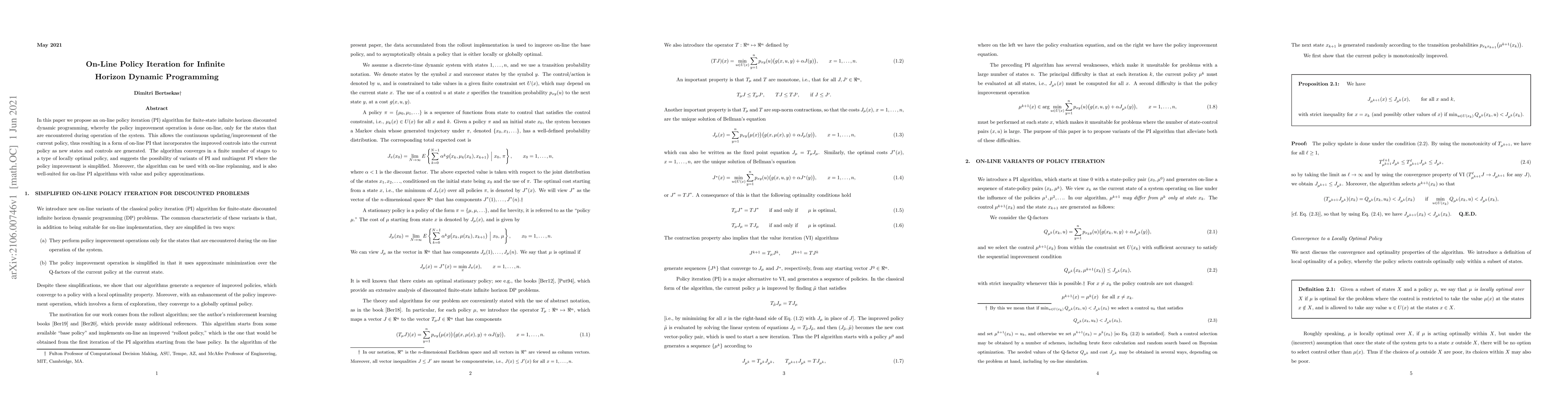 Researchers propose an on-line policy iteration algorithm for infinite horizon dynamic programming that updates policies continuously as new states are encountered, converging to a locally optimal solution.