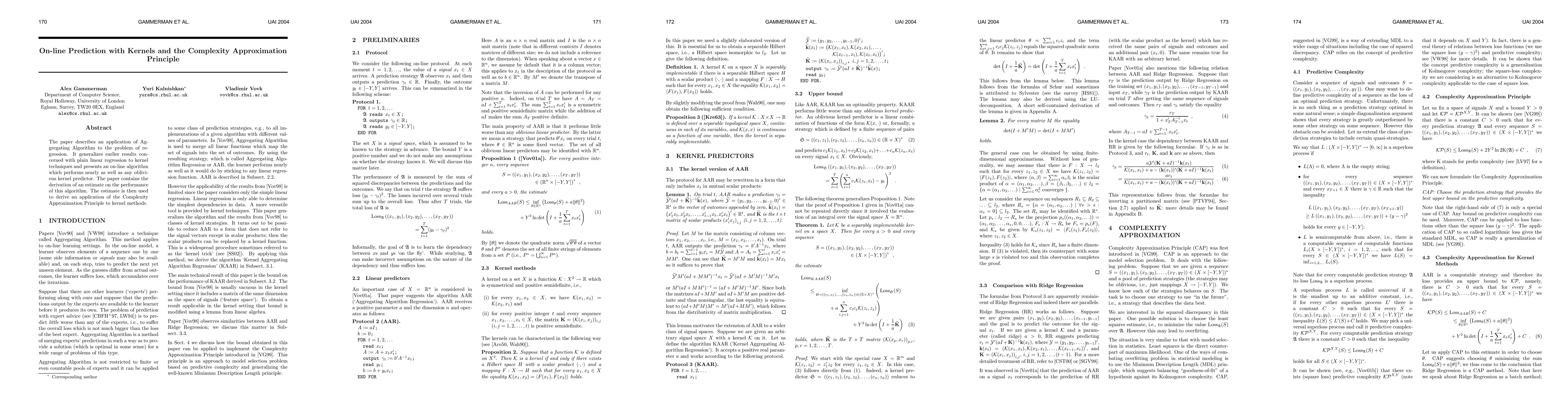 The paper describes an application of Aggregating Algorithm to the problem of regression. It generalizes earlier results concerned with plain linear regression to kernel techniques and presents an on-line algorithm which performs nearly as well as any oblivious kernel predictor. The paper contains the derivation of an estimate on the performance of this algorithm. The estimate is then used to derive an application of the Complexity Approximation Principle to kernel methods.