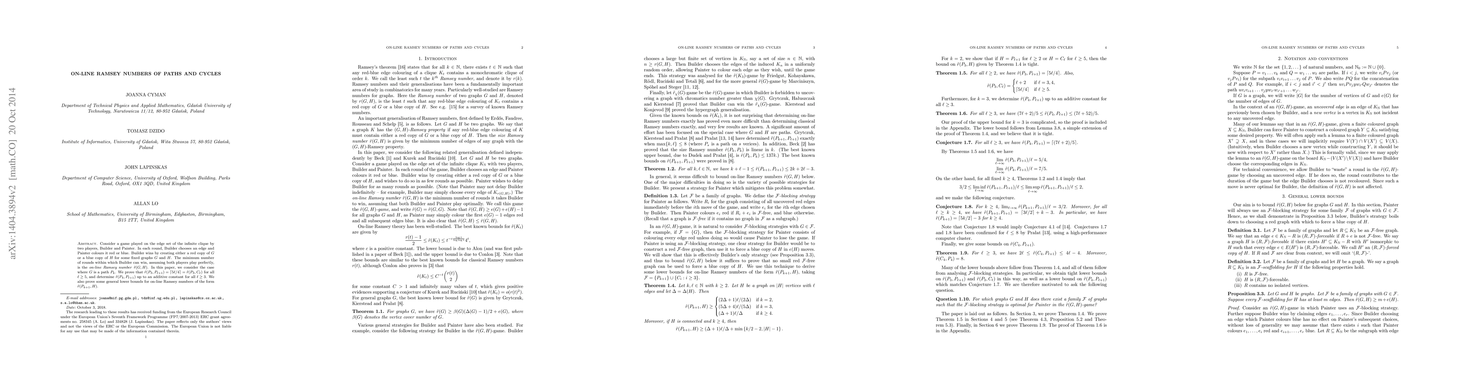 Consider a game played on the edge set of the infinite clique by two players, Builder and Painter. In each round, Builder chooses an edge and Painter colours it red or blue. Builder wins by creating either a red copy of $G$ or a blue copy of $H$ for some fixed graphs $G$ and $H$. The minimum number of rounds within which Builder can win, assuming both players play perfectly, is the on-line Ramsey number $\tilde{r}(G,H)$. In this paper, we consider the case where $G$ is a path $P_k$. We prove that $\tilde{r}(P_3, P_{\ell+1}) = \lceil 5\ell/4 \rceil = \tilde{r}(P_3, C_\ell)$ for all $\ell \ge 5$, and determine $\tilde{r}(P_4, P_{\ell+1}$) up to an additive constant for all $\ell \ge 3$. We also prove some general lower bounds for on-line Ramsey numbers of the form $\tilde{r}(P_{k+1},H)$.