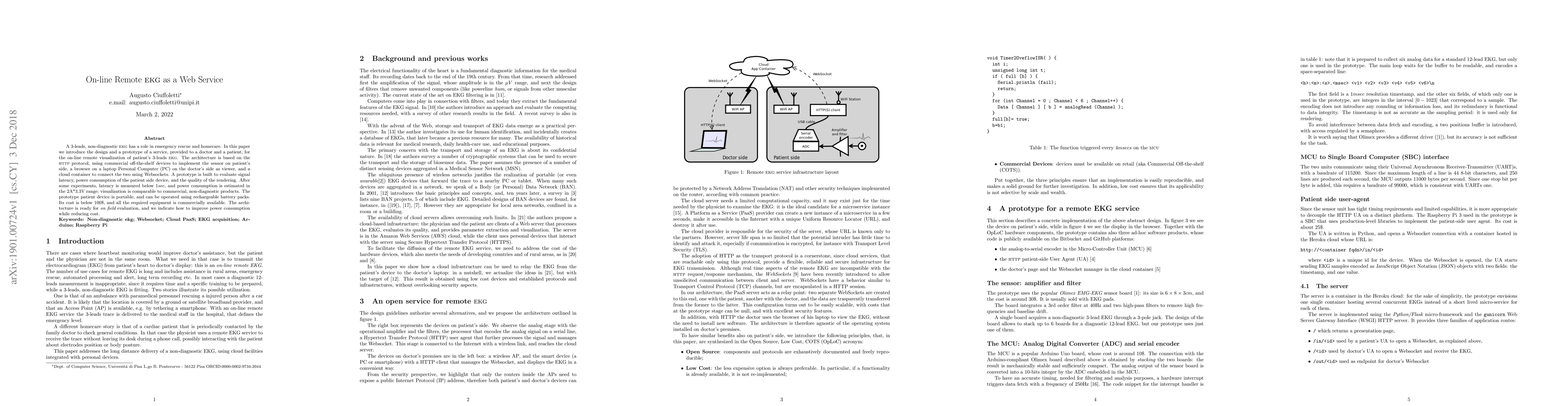 A 3-leads, non-diagnostic EKG has a role in emergency rescue and homecare. In this paper we introduce the design and a prototype of a service, provided to a doctor and a patient, for the on-line remote visualization of patient's 3-leads EKG. The architecture is based on the HTTP protocol, using commercial off-the-shelf devices to implement the sensor on patient's side, a browser on a laptop PC on the doctor's side as viewer, and a cloud container to connect the two using Websockets. A prototype is built to evaluate signal latency, power consumption of the patient side device, and the quality of the rendering. After some experiments, latency is measured below $1sec$, and power consumption is estimated in the 2A*3.3V range; visualization is comparable to commercial, non-diagnostic products. The prototype patient device is portable, and can be operated using rechargeable battery packs. Its cost is below 100\$, and all the required equipment is commercially available. The architecture is ready for on field evaluation, and we indicate how to improve power consumption while reducing cost.