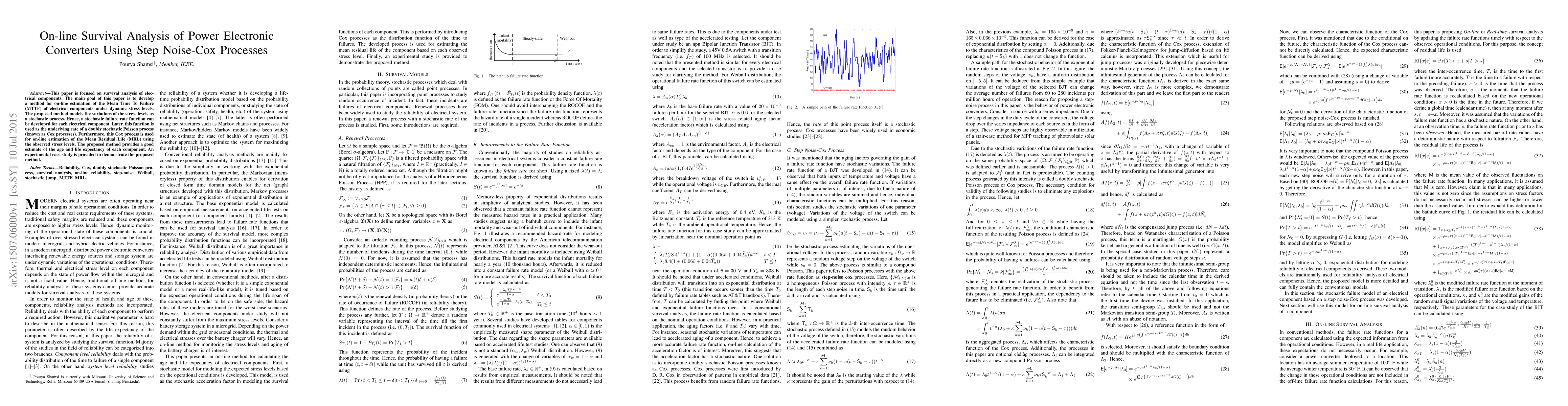 This paper is focused on survival analysis of electrical components. The main goal of this paper is to develop a method for on-line estimation of the Mean Time To Failure (MTTF) of electrical components under dynamic stress levels. The proposed method models the variations of the stress levels as a stochastic process. Hence, a stochastic failure rate function can be developed for each electrical component. Later, this function is used as the underlying rate of a doubly stochastic Poisson process (known as Cox processes). Furthermore, this Cox process is used for on-line estimation of the Mean Residual Life (MRL) using the observed stress levels. The proposed method provides a good estimate of the age and life expectancy of each component. An experimental case study is provided to demonstrate the proposed method.