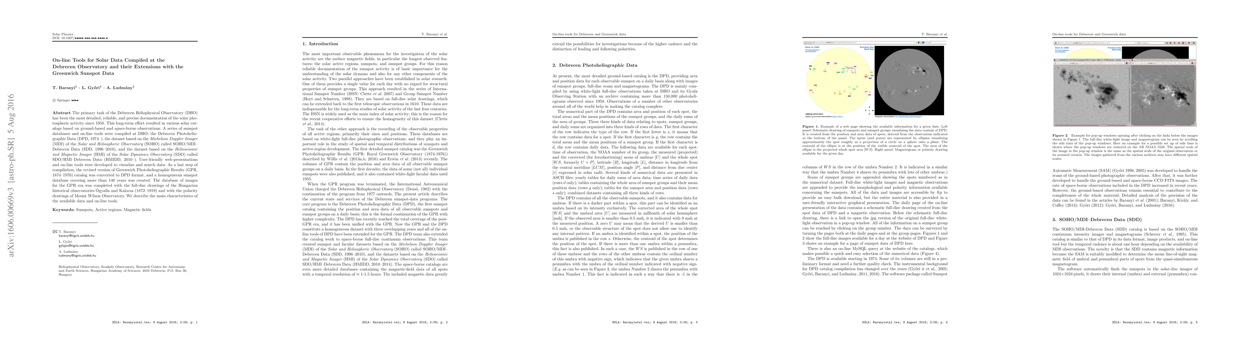 The Debrecen Heliophysical Observatory has compiled extensive solar photospheric activity data since 1958, including the Debrecen Photoheliographic Data (DPD), SOHO/MDI--Debrecen Data (SDD), and SDO/HMI--Debrecen Data (HMIDD). These datasets were supplemented with the Greenwich Photoheliographic Results (GPR) catalog, creating a comprehensive sunspot database spanning over 140 years.