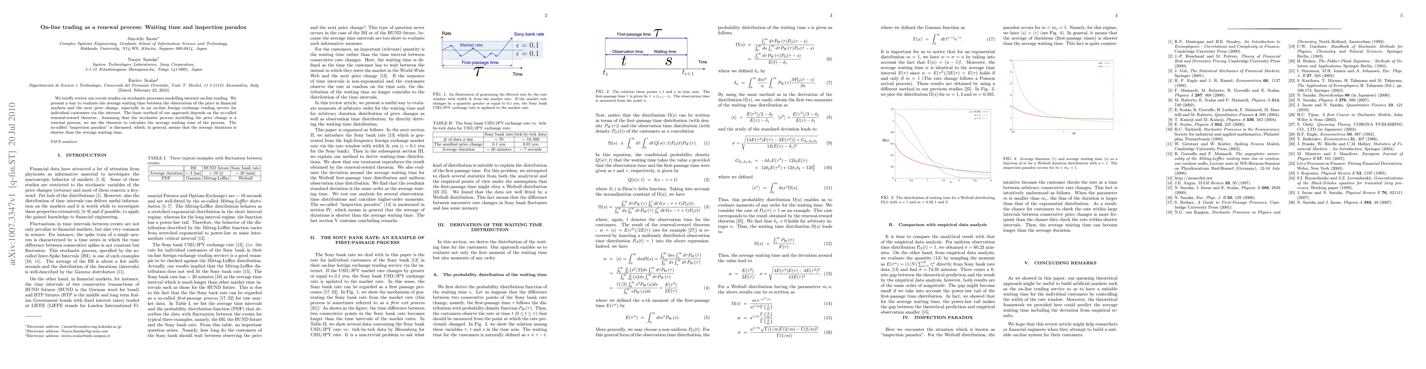 We briefly review our recent studies on stochastic processes modelling internet on-line trading. We present a way to evaluate the average waiting time between the observation of the price in financial markets and the next price change, especially in an on-line foreign exchange trading service for individual customers via the internet. The basic method of our approach depends on the so-called renewal-reward theorem. Assuming that the stochastic process modelling the price change is a renewal process, we use the theorem to calculate the average waiting time of the process. The so-called ``inspection paradox'' is discussed, which, in general, means that the average durations is shorter than the average waiting time.