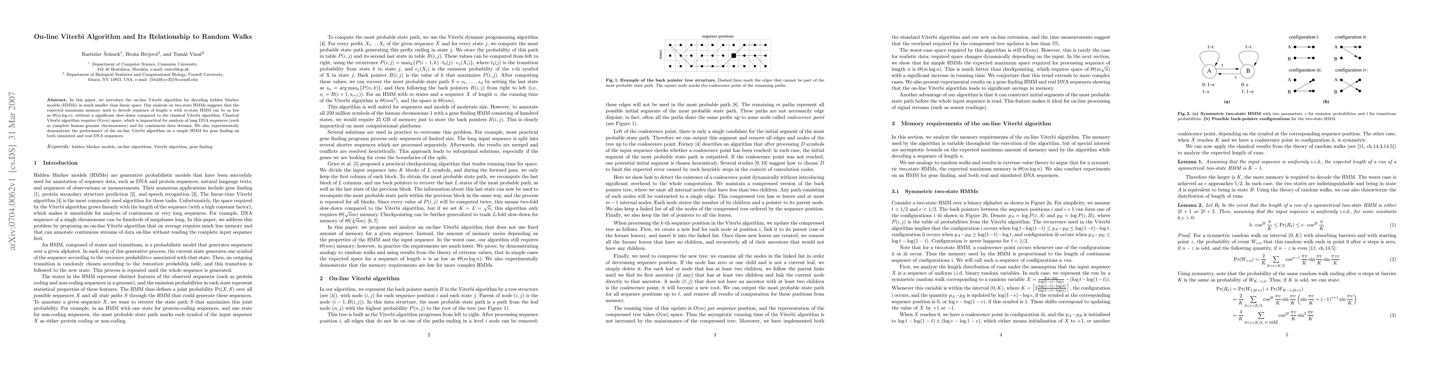 This paper presents an on-line Viterbi algorithm that decodes hidden Markov models using significantly less memory than the classical Viterbi algorithm, achieving $\Theta(m\log n)$ space complexity. Experimental results show its effectiveness for gene finding in DNA sequences.