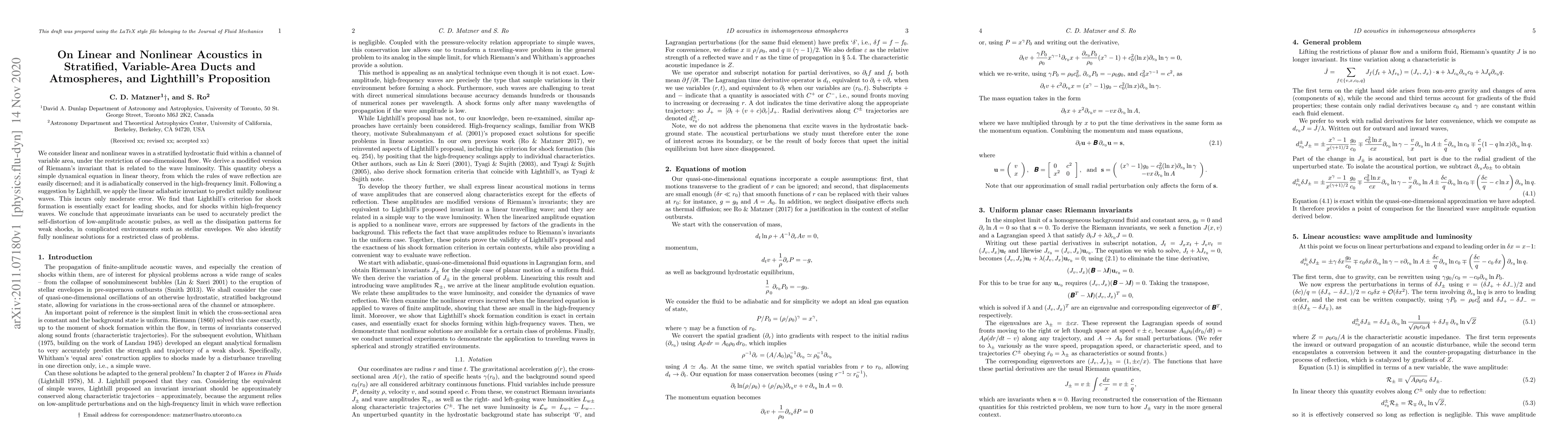Researchers studied linear and nonlinear waves in variable-area ducts and atmospheres, developing a modified version of Riemann's invariant to predict wave behavior and shock formation. Their findings suggest that approximate invariants can accurately predict the self-distortion of low-amplitude acoustic pulses and dissipation patterns of weak shocks.