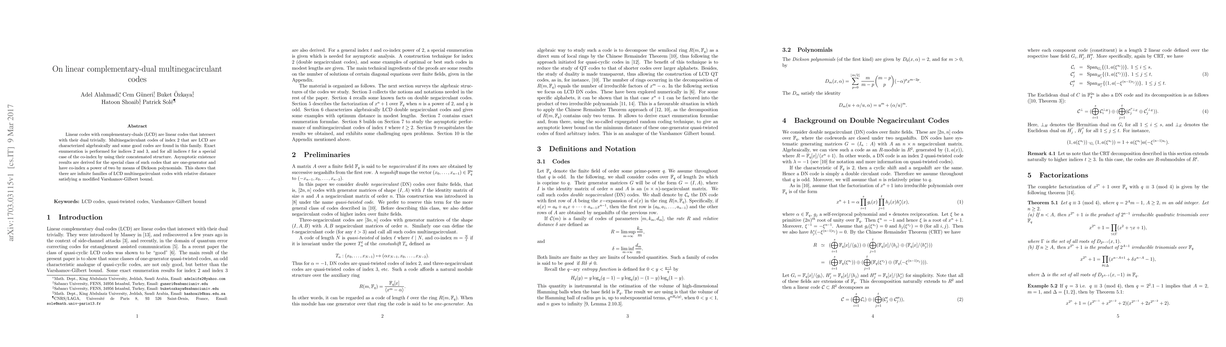 Linear codes with complementary-duals (LCD) are linear codes that intersect with their dual trivially. Multinegacirculant codes of index $2$ that are LCD are characterized algebraically and some good codes are found in this family. Exact enumeration is performed for indices 2 and 3, and for all indices $t$ for a special case of the co-index by using their concatenated structure. Asymptotic existence results are derived for the special class of such codes that are one-generator and have co-index a power of two by means of Dickson polynomials. This shows that there are infinite families of LCD multinegacirculant codes with relative distance satisfying a modified Varshamov-Gilbert bound.
