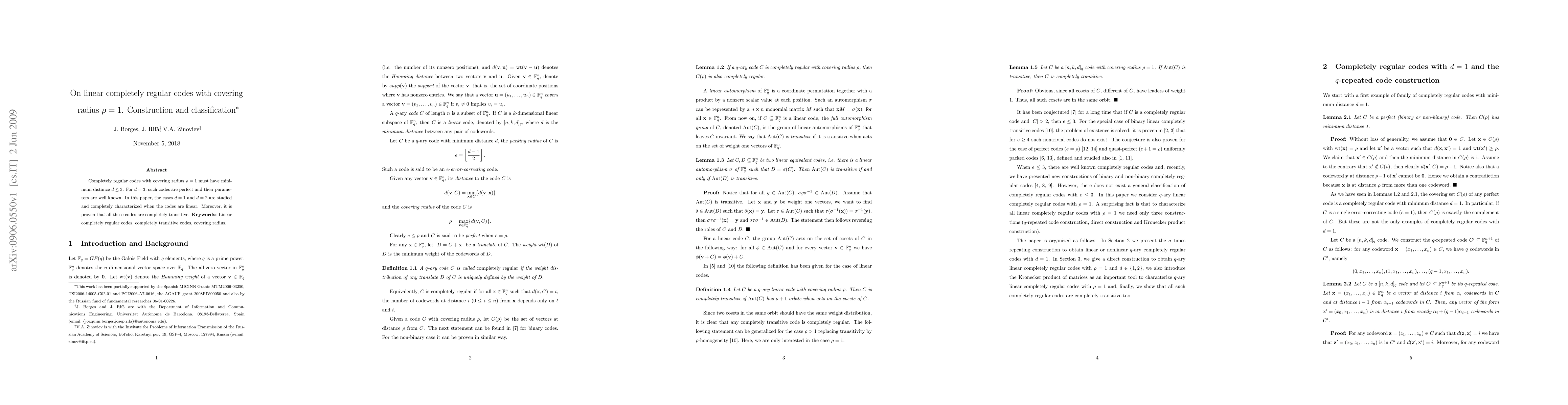 Research characterizes linear completely regular codes with covering radius α=1, focusing on cases where minimum distance is 1 or 2, proving they are completely transitive.
