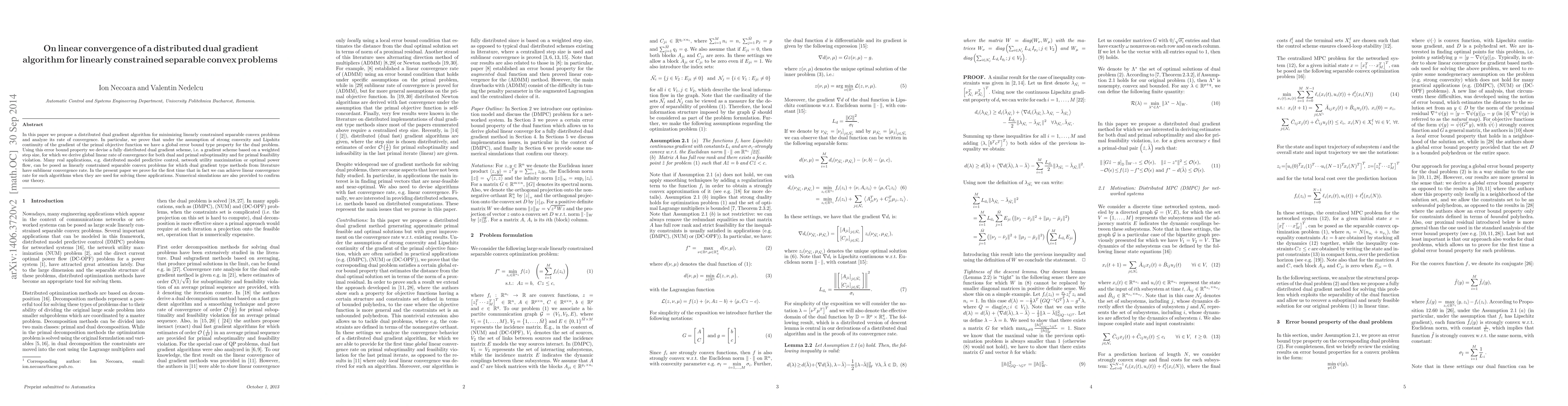 This paper proposes a distributed dual gradient algorithm for solving linearly constrained separable convex problems, proving linear convergence under strong convexity and Lipschitz continuity assumptions. Numerical simulations confirm the theoretical linear convergence rate for applications like distributed model predictive control.