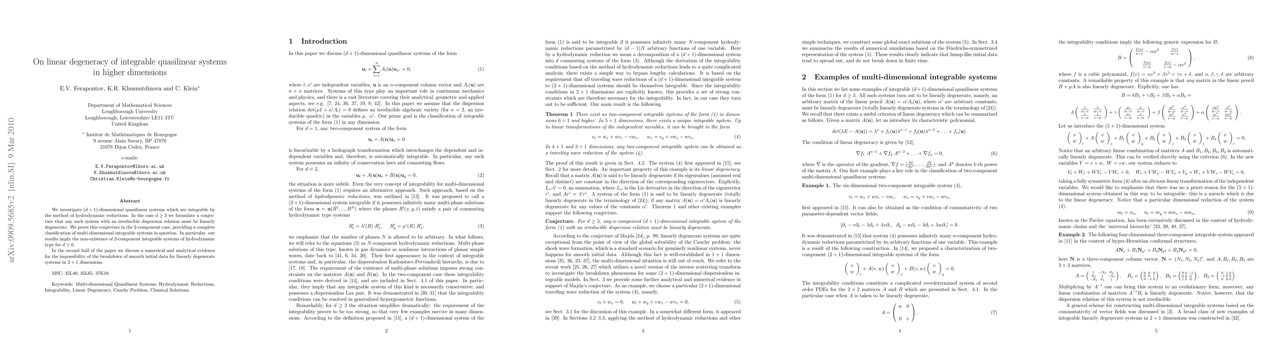 Researchers investigate integrable quasilinear systems in higher dimensions and conjecture that linearly degenerate systems exist for d >= 3 with an irreducible dispersion relation. They prove this conjecture in the 2-component case, implying no 2-component integrable systems of hydrodynamic type for d >= 6.
