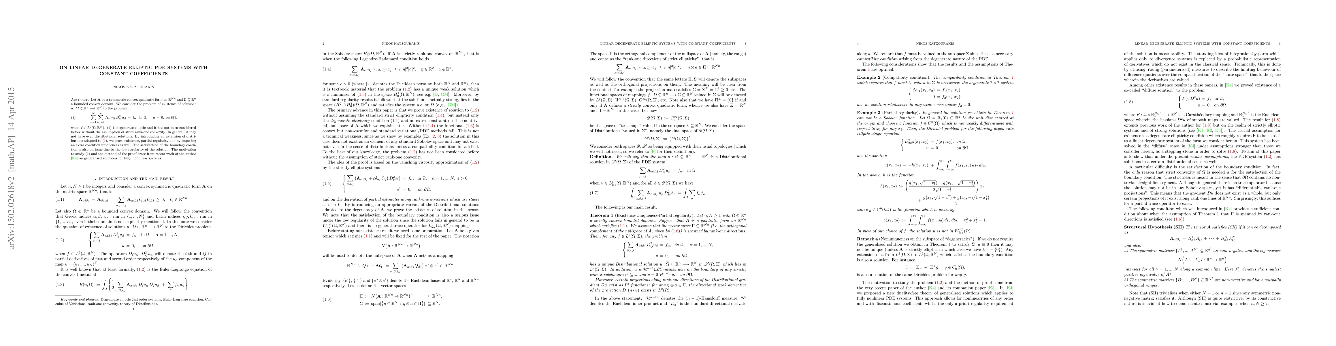 Let $\textbf{A}$ be a symmetric convex quadratic form on $\mathbb{R}^{Nn}$ and $\Omega\Subset \mathbb{R}^n$ a bounded convex domain. We consider the problem of existence of solutions $u: \Omega \subset \mathbb{R}^n \longrightarrow \mathbb{R}^N$ to the problem \[ \tag{1} \label{1} \begin{split} \sum_{\beta=1}^N\sum_{i,j=1}^n \textbf{A}_{\alpha i \beta j}\, D^2_{ij}u_\beta \,=\, f_\alpha, \text{ in }\Omega,\quad \ u\,=\, 0, \text{ on }\partial \Omega, \end{split} \] when $ f\in L^2(\Omega,\mathbb{R}^N)$. \eqref{1} is degenerate elliptic and it has not been considered before without the assumption of strict rank-one convexity. In general, it may not have even distributional solutions. By introducing an extension of distributions adapted to \eqref{1}, we prove existence, partial regularity and by imposing an extra condition uniqueness as well. The satisfaction of the boundary condition is also an issue due to the low regularity of the solution. The motivation to study \eqref{1} and the method of the proof arose from recent work of the author [K4, arXiv:1501.06164] on generalised solutions for fully nonlinear systems.