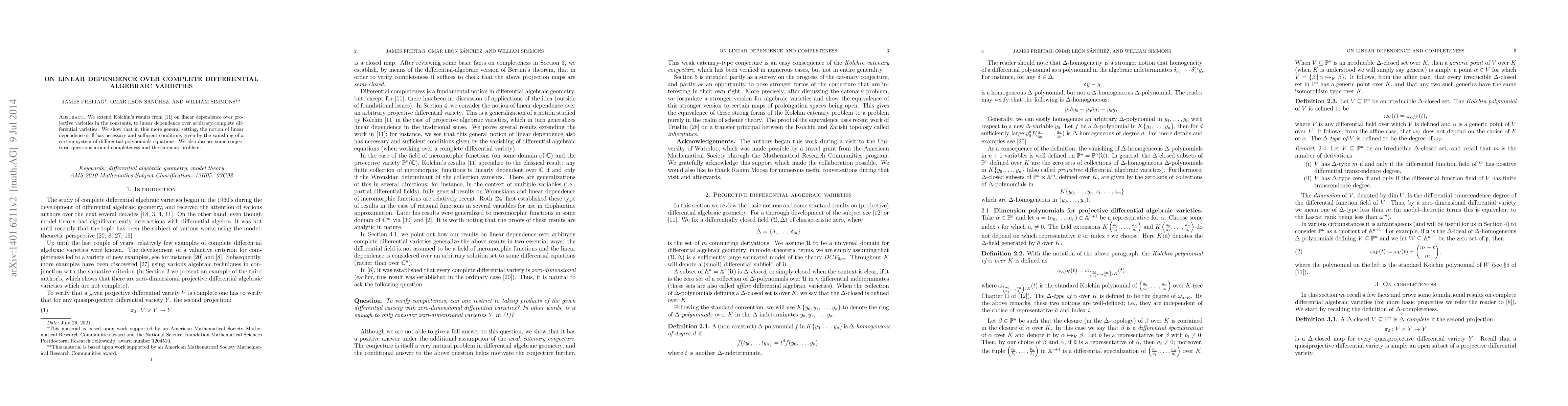 We extend Kolchin's results on linear dependence over projective varieties in the constants, to linear dependence over arbitrary complete differential varieties. We show that in this more general setting, the notion of linear dependence still has necessary and sufficient conditions given by the vanishing of a certain system of differential polynomials equations. We also discuss some conjectural questions around completeness and the catenary problem.