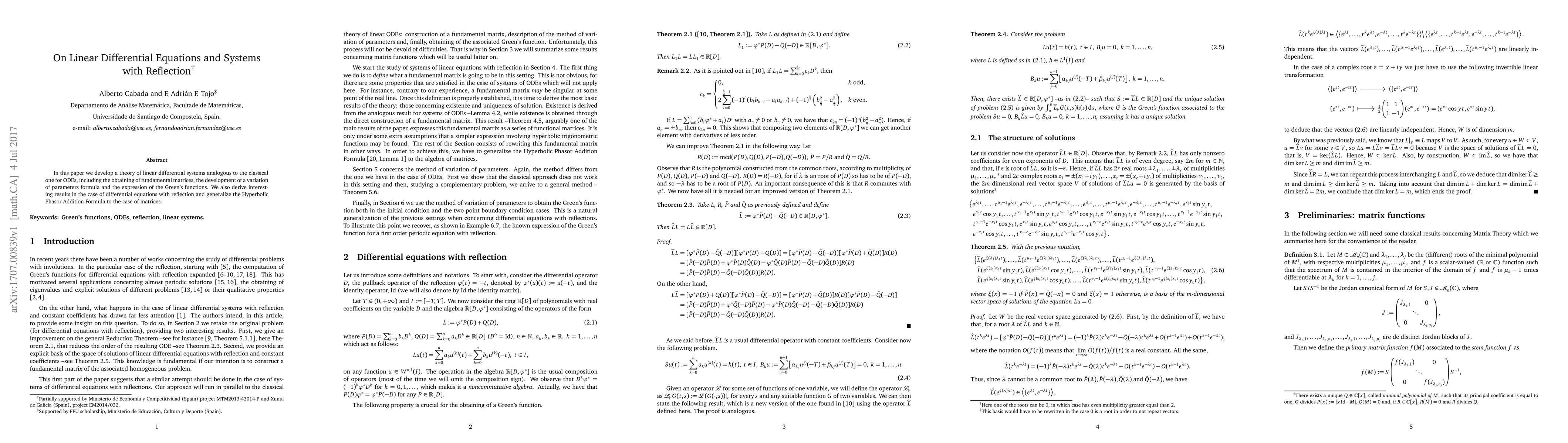 This paper presents a theory for linear differential systems, akin to classical ODE theory, involving fundamental matrices, variation of parameters formula, and Green's functions. It also explores differential equations with reflection, generalizing the Hyperbolic Phasor Addition Formula for matrices.