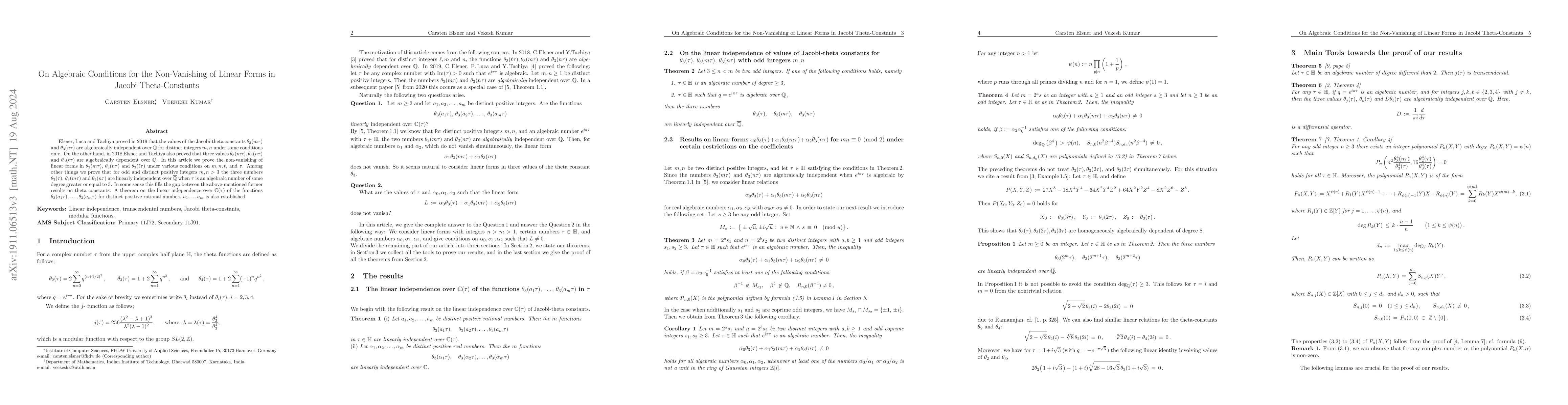 This paper proves that specific linear forms involving Jacobi theta constants are non-vanishing under certain conditions, filling a gap in previous results on theta constants.