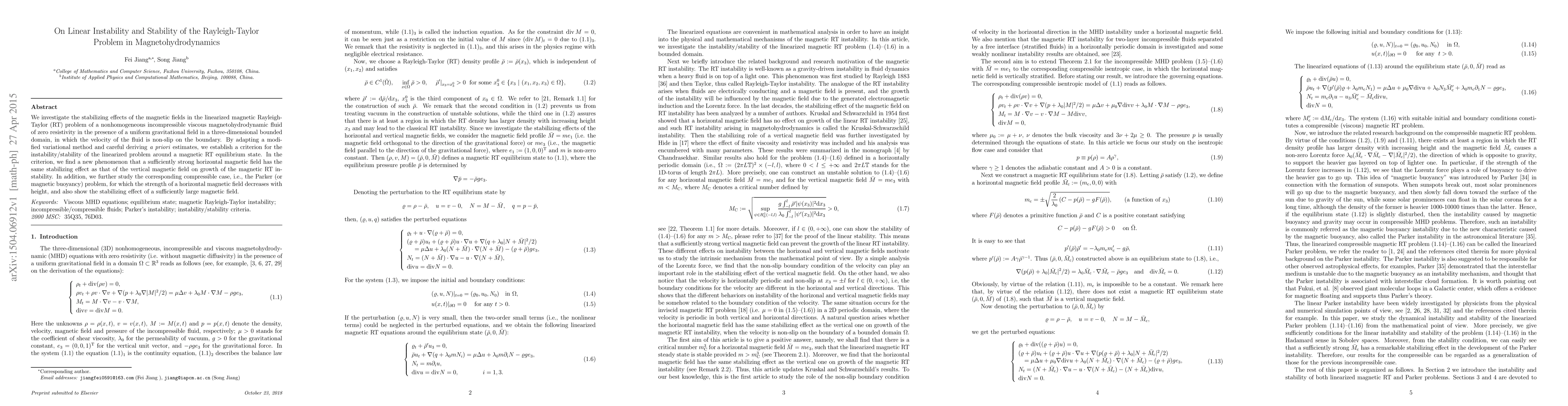 This paper explores the linear instability and stability of the magnetic Rayleigh-Taylor problem in magnetohydrodynamics, revealing that a sufficiently strong horizontal magnetic field can stabilize the system similarly to a vertical magnetic field. The study also extends findings to the compressible Parker problem, demonstrating the stabilizing effect of a large magnetic field.