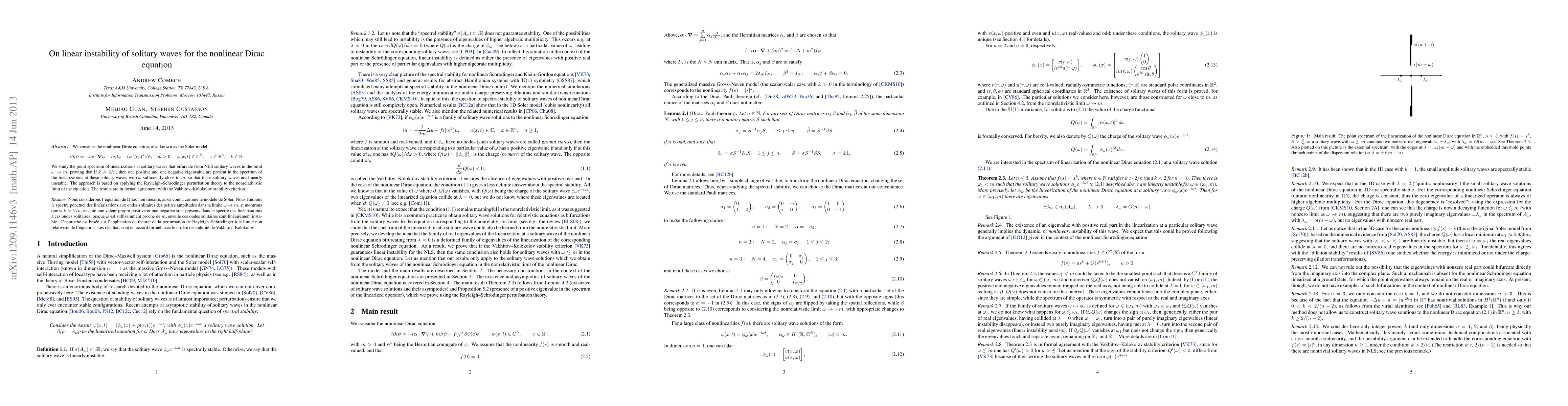 This paper investigates the spectral stability of solitary wave solutions for the nonlinear Dirac equation, demonstrating that solitary waves with $k > 2/n$ exhibit linear instability due to the presence of one positive and one negative eigenvalue in the linearized system's spectrum near the critical frequency. The analysis employs Rayleigh-Schroedinger perturbation theory and aligns with the Vakhitov-Kolokolov stability criterion.