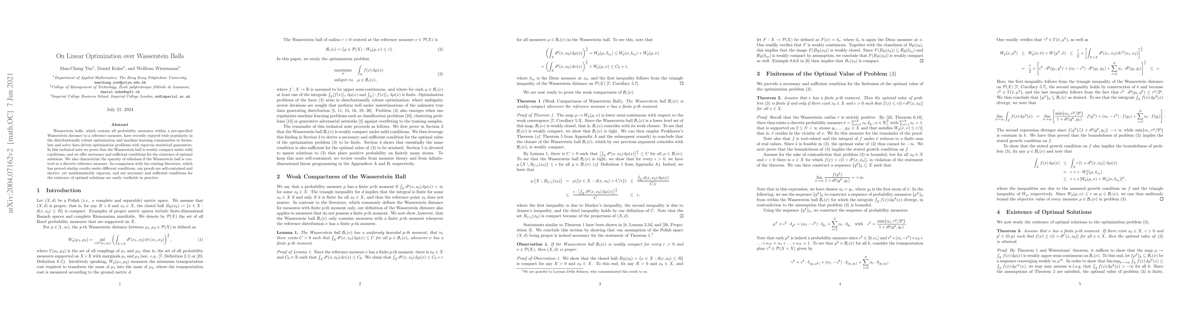 This paper proves the weak compactness of Wasserstein balls under mild conditions and provides necessary and sufficient conditions for optimal solutions' existence. It also characterizes solution sparsity when centered at a discrete reference measure, offering shorter and more rigorous proofs compared to existing literature.
