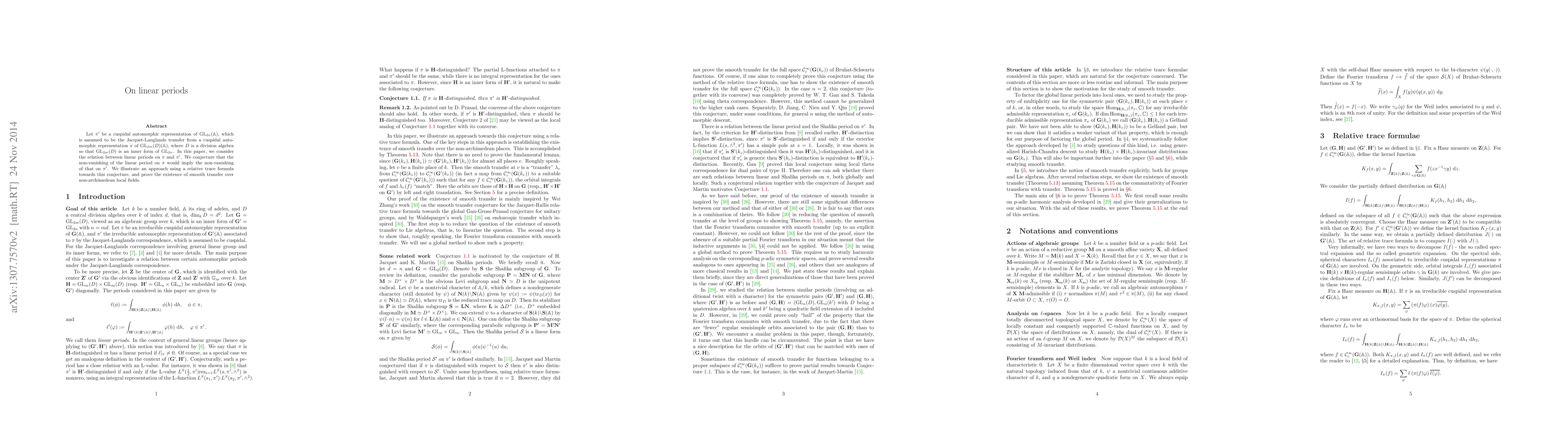 This paper explores the connection between linear periods in cuspidal automorphic representations, particularly focusing on the Jacquet-Langlands transfer between $GL_{2n}$ and $GL_{2m}(D)$. The authors conjecture that the non-vanishing of a linear period in the original representation implies its non-vanishing in the transferred representation, and provide a proof using a relative trace formula for non-archimedean local fields.