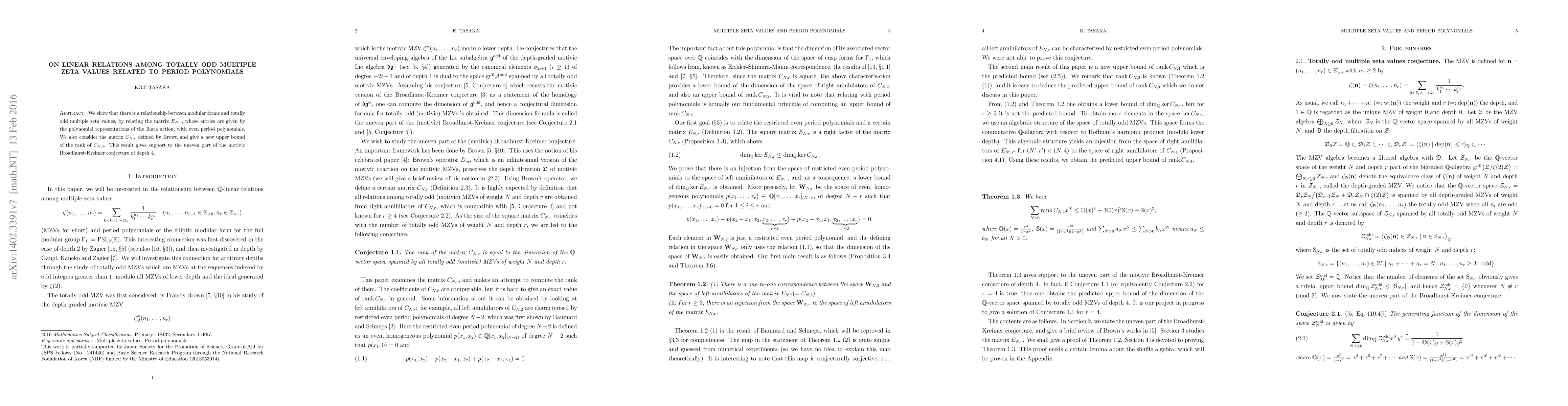 We show that there is a relationship between modular forms and totally odd multiple zeta values, by relating the matrix $E_{N,r}$, whose entries are given by the polynomial representations of the Ihara action, with even period polynomials. We also consider the matrix $C_{N,r}$ defined by Brown and give a new upper bound of the rank of $C_{N,4}$. This result gives support to the uneven part of the motivic Broadhurst-Kreimer conjecture of depth 4.