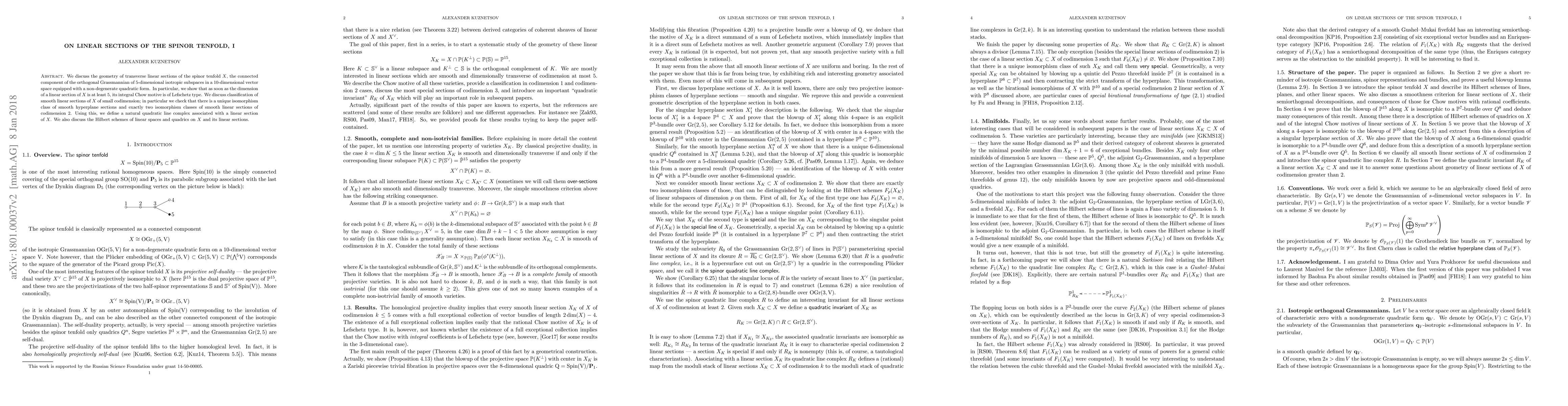 Researchers explore the geometry of linear sections in the spinor tenfold, revealing new insights on their integral Chow motive structure and quadratic line complexes, with implications for understanding Hilbert schemes and quadrics.
