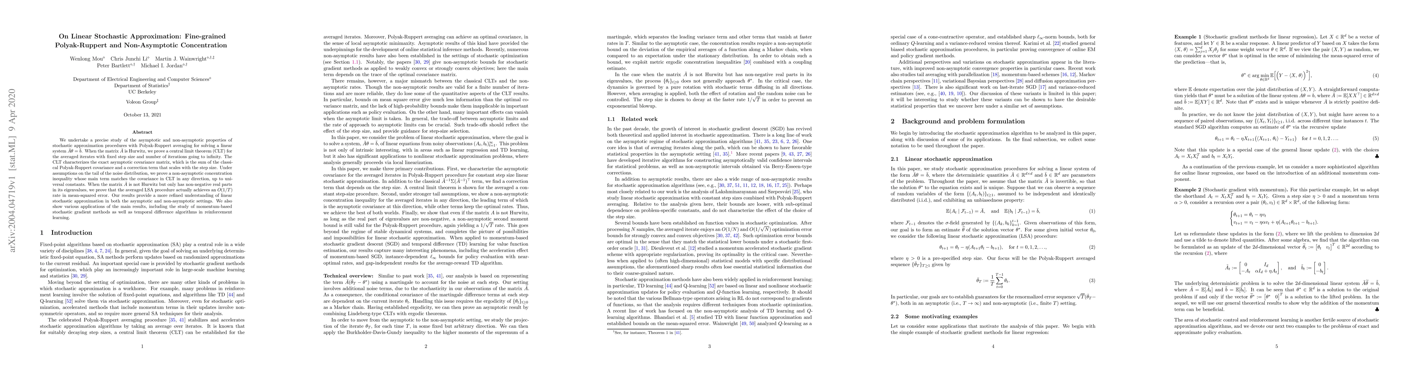 We undertake a precise study of the asymptotic and non-asymptotic properties of stochastic approximation procedures with Polyak-Ruppert averaging for solving a linear system $\bar{A} \theta = \bar{b}$. When the matrix $\bar{A}$ is Hurwitz, we prove a central limit theorem (CLT) for the averaged iterates with fixed step size and number of iterations going to infinity. The CLT characterizes the exact asymptotic covariance matrix, which is the sum of the classical Polyak-Ruppert covariance and a correction term that scales with the step size. Under assumptions on the tail of the noise distribution, we prove a non-asymptotic concentration inequality whose main term matches the covariance in CLT in any direction, up to universal constants. When the matrix $\bar{A}$ is not Hurwitz but only has non-negative real parts in its eigenvalues, we prove that the averaged LSA procedure actually achieves an $O(1/T)$ rate in mean-squared error. Our results provide a more refined understanding of linear stochastic approximation in both the asymptotic and non-asymptotic settings. We also show various applications of the main results, including the study of momentum-based stochastic gradient methods as well as temporal difference algorithms in reinforcement learning.