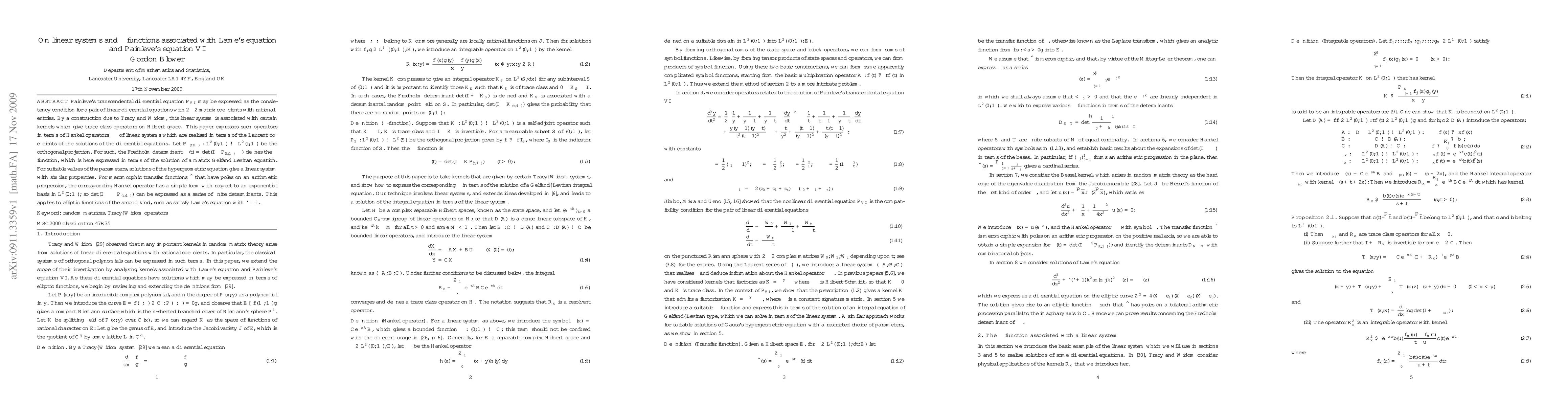 Painleve's transcendental differential equation P_{VI} may be expressed as the consistency condition for a pair of linear differential equations with 2 by 2 matrix coefficients with rational entries. By a construction due to Tracy and Widom, this linear system is associated with certain kernels which give trace class operators on Hilbert space. This paper expresses such operators in terms of the Hankel operators \Gamma_\phi of linear systems which are realised in terms of the Laurent coefficients of the solutions of the differential equations. Let P_{(t infty)}:L^2(0, \infty)\to L^2(t, \infty) be the orthogonal projection. For such, the Fredholm determinant \tau (t)=det (I-P_{(t, \infty)}\Gamma_\phi) defines the tau function, which is here expressed in terms of the solutions of a matrix Gelfand--Levitan equation. For suitable paramters, solutions of the hypergeometric equation give a linear system with similar properties. For meromorphic transfer functions \hat\phi that have poles on an arithmetic progression, the corresponding Hankel operator has a simple form with respect to an exponential basis in L^2(0, \infty); so \tau (t) can be expressed in terms of finite determinants. This applies to elliptic functions of the second kind, such as satisfy Lame's equation with \ell=1.