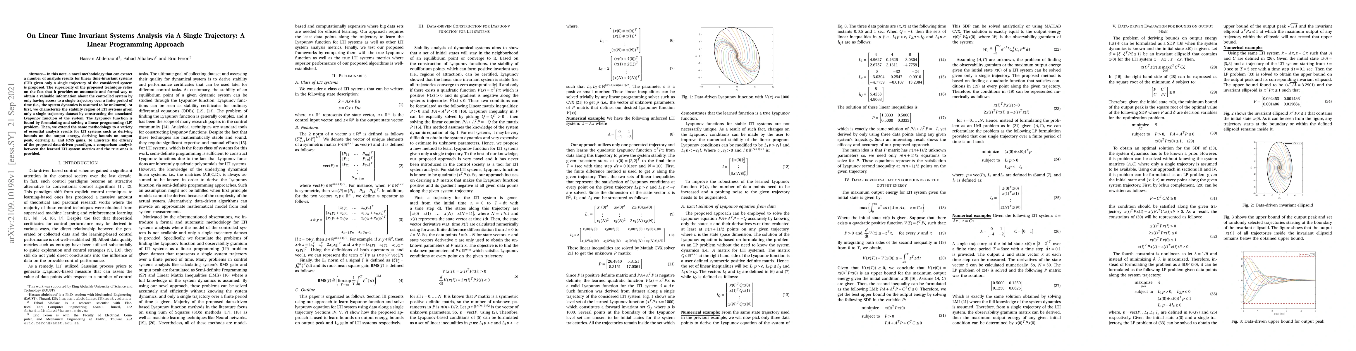 In this note, a novel methodology that can extract a number of analysis results for linear time-invariant systems (LTI) given only a single trajectory of the considered system is proposed. The superiority of the proposed technique relies on the fact that it provides an automatic and formal way to obtain valuable information about the controlled system by only having access to a single trajectory over a finite period of time (i.e., the system dynamics is assumed to be unknown). At first, we characterize the stability region of LTI systems given only a single trajectory dataset by constructing the associated Lyapunov function of the system. The Lyapunov function is found by formulating and solving a linear programming (LP) problem. Then, we extend the same methodology to a variety of essential analysis results for LTI systems such as deriving bounds on the output energy, deriving bounds on output peak, deriving $\mathbf{L}_2$ and RMS gains. To illustrate the efficacy of the proposed data-driven paradigm, a comparison analysis between the learned LTI system metrics and the true ones is provided.