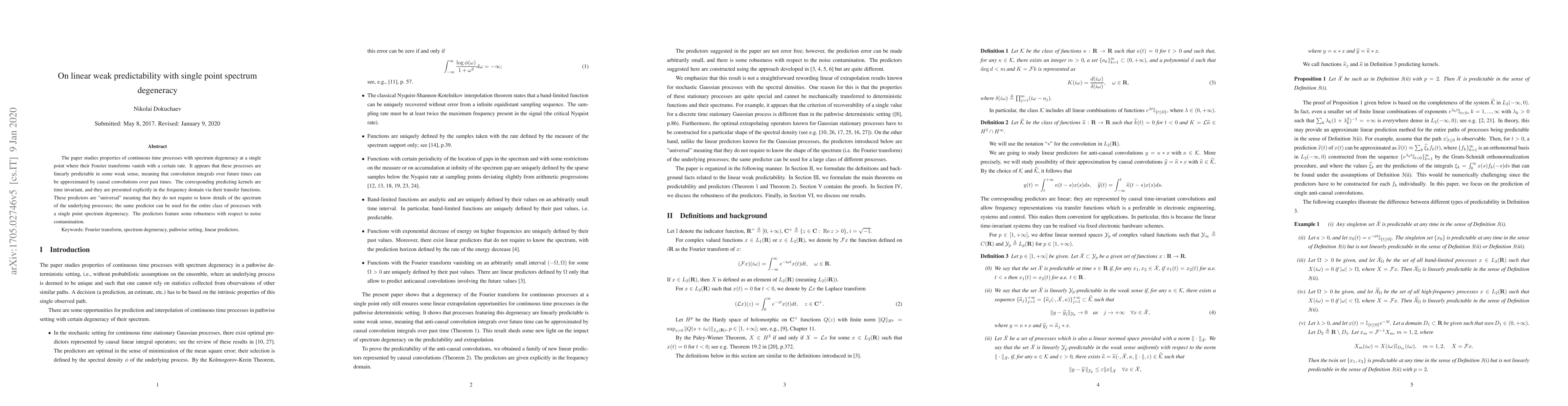 The research identifies that continuous-time processes with spectrum degeneracy at a single point, where Fourier transforms vanish at a certain rate, can be linearly predicted using time-invariant kernels. These kernels, presented in the frequency domain, are 'universal' for the entire class of such processes, and show robustness against noise. This suggests a general method for predicting a specific category of stochastic processes.