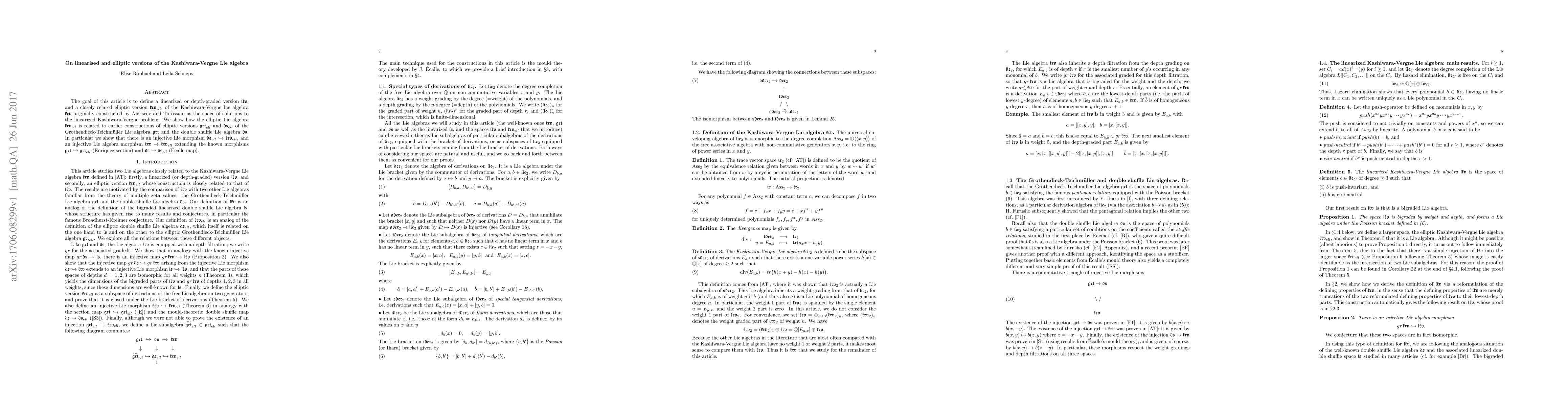 The goal of this article is to define a linearized or depth-graded version $\mathfrak{lkv}$, and a closely related elliptic version $\mathfrak{krv}_{ell}$, of the Kashiwara-Vergne Lie algebra $\mathfrak{krv}$ originally constructed by Alekseev and Torossian as the space of solutions to the linearized Kashiwara-Vergne problem. We show how the elliptic Lie algebra $\mathfrak{krv}_{ell}$ is related to earlier constructions of elliptic versions $\mathfrak{grt}_{ell}$ and $\mathfrak{ds}_{ell}$ of the Grothendieck-Teichm\"uller Lie algebra $\mathfrak{grt}$ and the double shuffle Lie algebra $\mathfrak{ds}$. In particular we show that there is an injective Lie morphism $\mathfrak{ds}_{ell}\hookrightarrow \mathfrak{krv}_{ell}$, and an injective Lie algebra morphism $\mathfrak{krv}\rightarrow \mathfrak{krv}_{ell}$ extending the known morphisms $\mathfrak{grt}\hookrightarrow\mathfrak{grt}_{ell}$ (Enriquez section) and $\mathfrak{ds}\rightarrow\mathfrak{ds}_{ell}$ (\'Ecalle map).