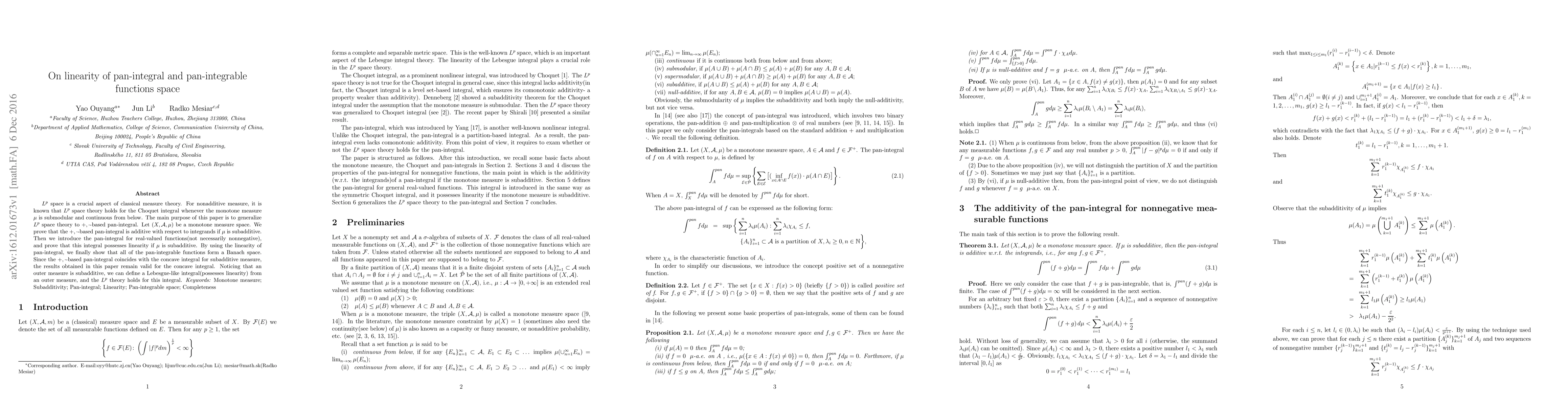 $L\sp{p}$ space is a crucial aspect of classical measure theory. For nonadditive measure, it is known that $L\sp{p}$ space theory holds for the Choquet integral whenever the monotone measure $\mu$ is submodular and continuous from below. The main purpose of this paper is to generalize $L\sp{p}$ space theory to $+,\cdot$-based pan-integral. Let $(X, {\cal A}, \mu)$ be a monotone measure space. We prove that the $+,\cdot$-based pan-integral is additive with respect to integrands if $\mu$ is subadditive. Then we introduce the pan-integral for real-valued functions(not necessarily nonnegative), and prove that this integral possesses linearity if $\mu$ is subadditive. By using the linearity of pan-integral, we finally show that all of the pan-integrable functions form a Banach space. Since the $+,\cdot$-based pan-integral coincides with the concave integral for subadditive measure, the results obtained in this paper remain valid for the concave integral. Noticing that an outer measure is subadditive, we can define a Lebesgue-like integral(possesses linearity) from an outer measure, and the $L\sp{p}$ theory holds for this integral. {\it Keywords:} Monotone measure; Subadditivity; Pan-integral; Linearity; Pan-integrable space; Completeness