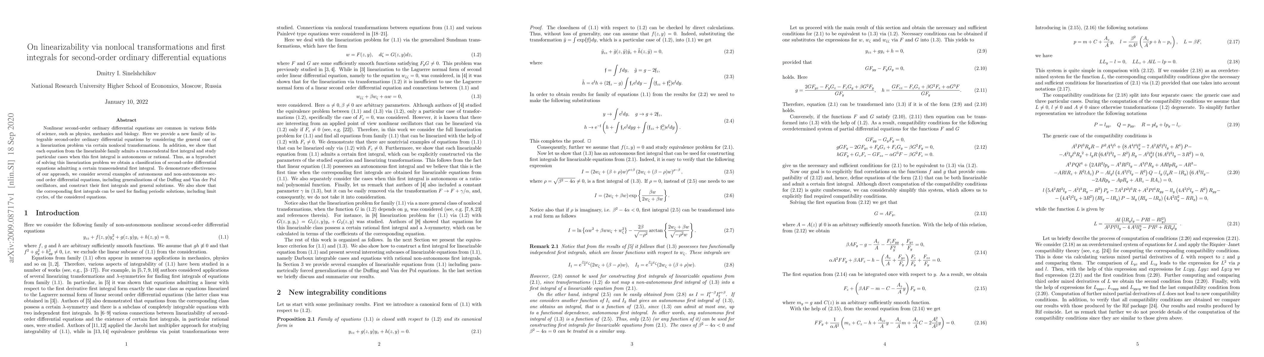 This paper presents a new method for linearizing nonlinear second-order ordinary differential equations using nonlocal transformations and identifies a family of integrable equations with transcendental first integrals. It demonstrates the method's effectiveness through examples, including generalized Duffing and Van der Pol oscillators, and shows how the first integrals can help find periodic solutions and limit cycles.