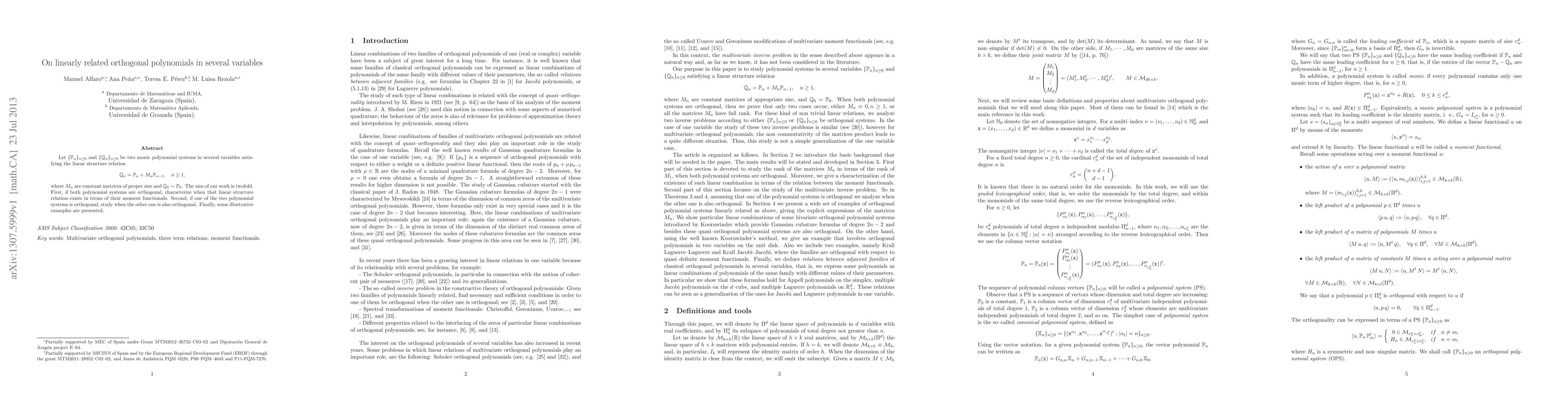This research paper explores linearly related orthogonal polynomials in several variables, focusing on their moment functionals and the conditions for one system to be orthogonal when the other is not.