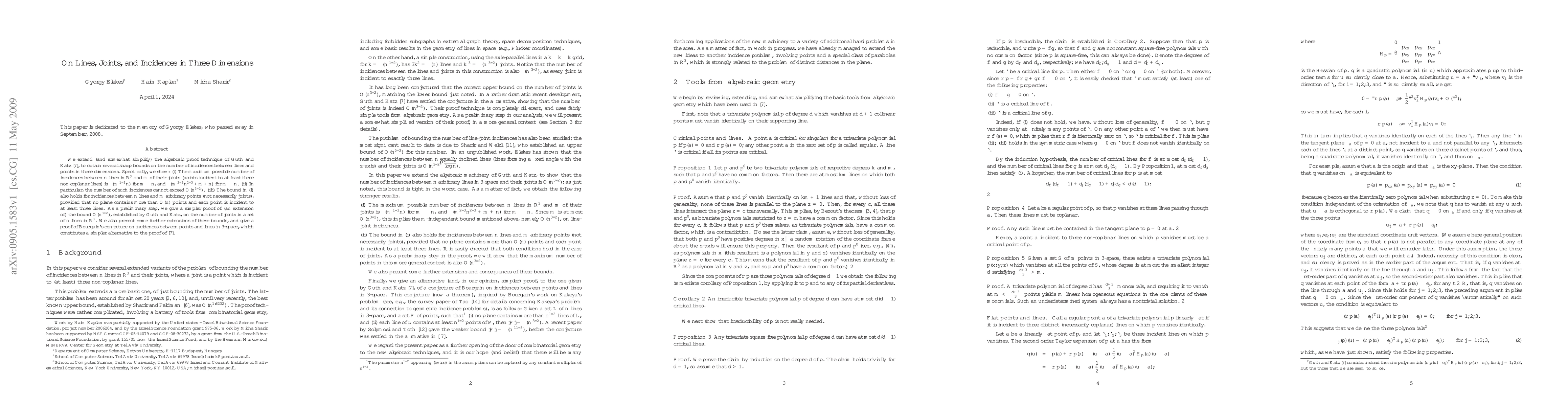 This paper extends and simplifies Guth and Katz's algebraic proof technique to derive sharp bounds on incidences between lines and points in three dimensions, showing that the maximum number of incidences between $n$ lines and $m$ joints is $\Theta(m^{1/3}n)$ for $m\ge n$ and $\Theta(m^{2/3}n^{2/3}+m+n)$ for $m\le n$, and that the number of such incidences cannot exceed $O(n^{3/2})$.