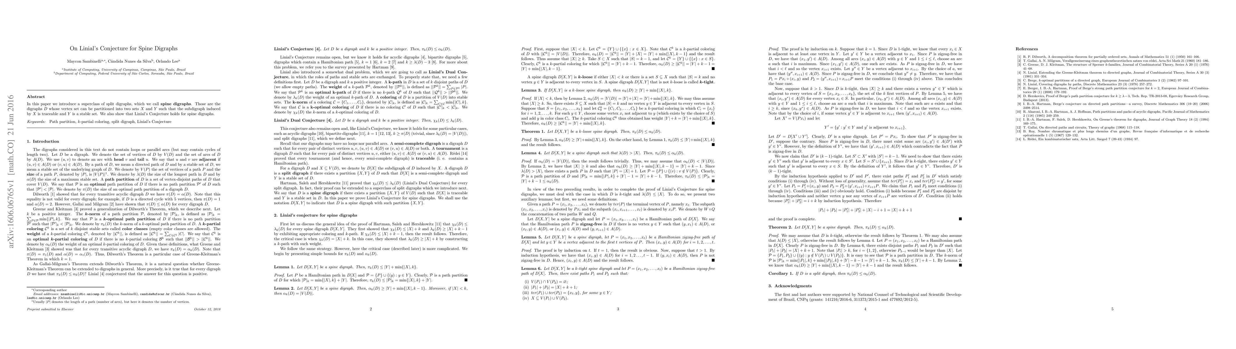 This paper introduces spine digraphs, a superclass of split digraphs, and proves that Linial's Conjecture holds for these digraphs, where the vertex set can be partitioned into a traceable subdigraph and a stable set.