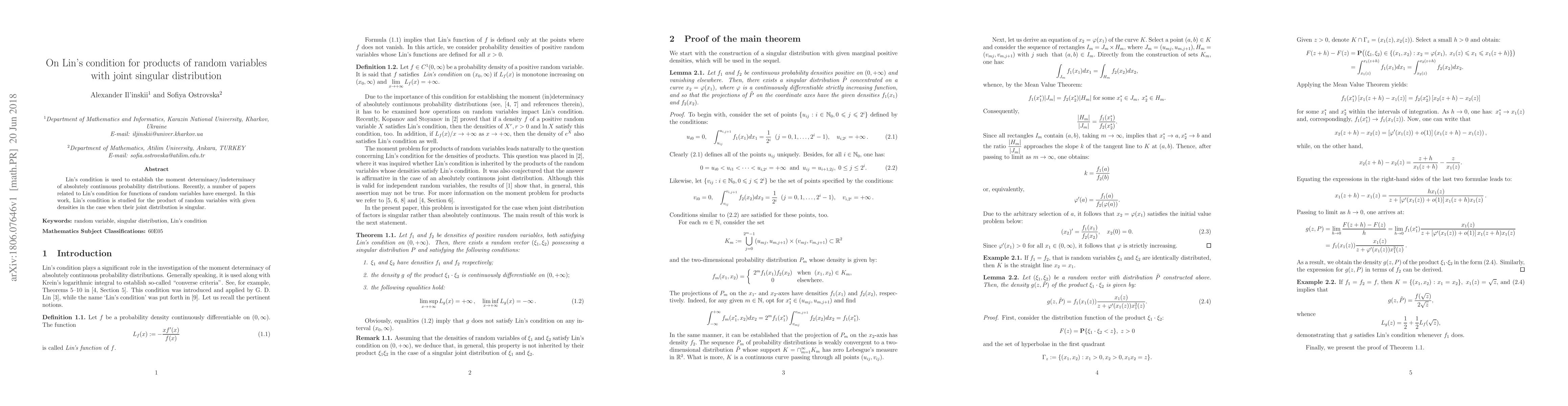 Lin's condition is used to establish the moment determinacy/indeterminacy of absolutely continuous probability distributions. Recently, a number of papers related to Lin's condition for functions of random variables have emerged. In this work, Lin's condition is studied for the product of random variables with given densities in the case when their joint distribution is singular.