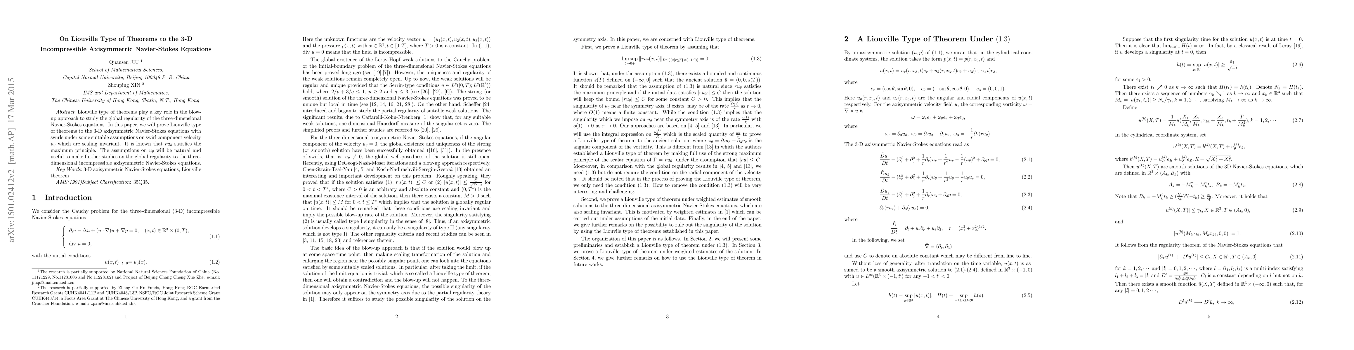 Liouville type of theorems play a key role in the blow-up approach to study the global regularity of the three-dimensional Navier-Stokes equations. In this paper, we will prove Liouville type of theorems to the 3-D axisymmetric Navier-Stokes equations with swirls under some suitable assumptions on swirl component velocity $u_\theta$ which are scaling invariant. It is known that $ru_\theta$ satisfies the maximum principle. The assumptions on $u_\theta$ will be natural and useful to make further studies on the global regularity to the three-dimensional incompressible axisymmetric Navier-Stokes equations.