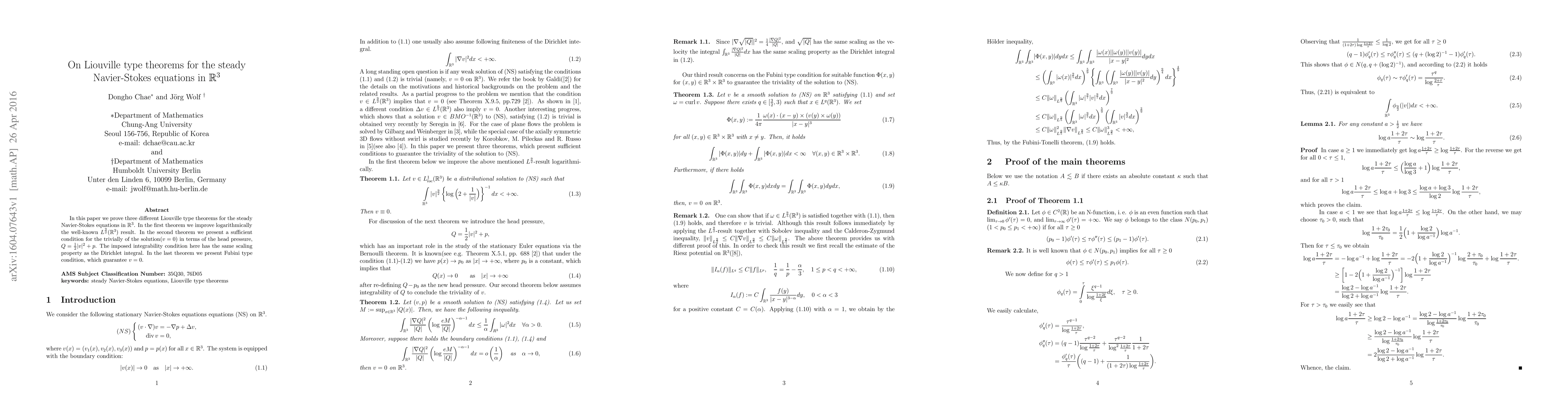 This paper proves three Liouville type theorems for steady Navier-Stokes equations in ∣³³³, improving a logarithmic result and introducing new conditions to guarantee a trivial solution.
