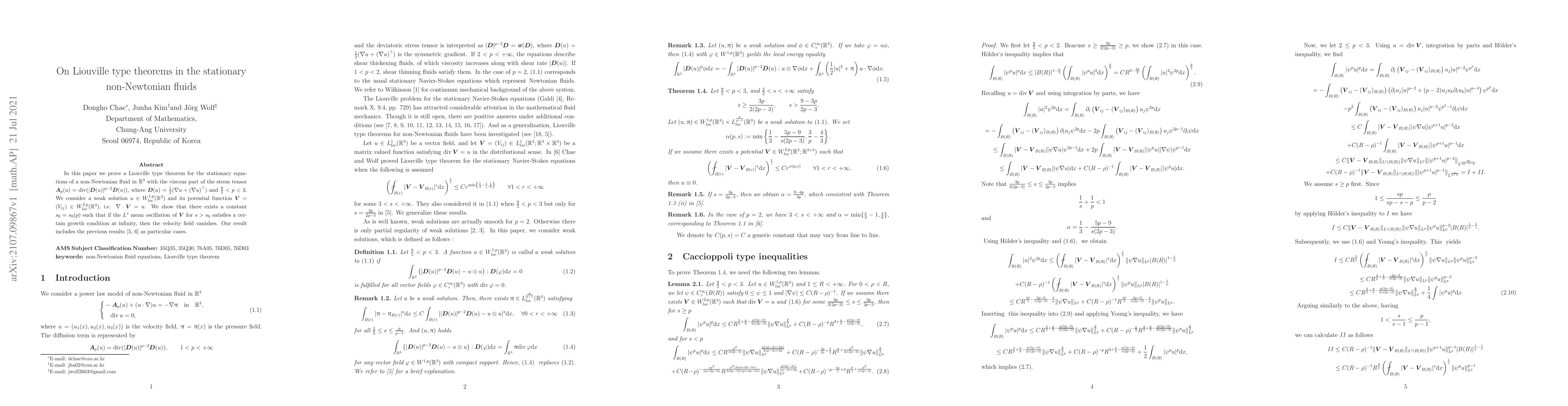 In this paper we prove a Liouville type theorem for the stationary equations of a non-Newtonian fluid in $\mathbb{R}^3$ with the viscous part of the stress tensor $\mathbf{A}_p(u) = \mathrm{div} ( | \mathbf{D}(u) |^{p-2} \mathbf{D}(u) )$, where $\mathbf{D}(u) = \frac 12 ( \nabla u + ( \nabla u )^{\top})$ and $\frac 95 < p < 3$. We consider a weak solution $u \in W^{1,p}_{loc}(\mathbb{R}^3)$ and its potential function $\mathbf{V} = (V_{ij}) \in W^{2,p}_{loc}(\mathbb{R}^3)$, i.e. $\nabla \cdot \mathbf{V} = u$. We show that there exists a constant $s_0=s_0(p)$ such that if the $L^s$ mean oscillation of $\mathbf{V}$ for $s>s_0$ satisfies a certain growth condition at infinity, then the velocity field vanishes. Our result includes the previous results \cite{CW20, CW19} as particular cases.