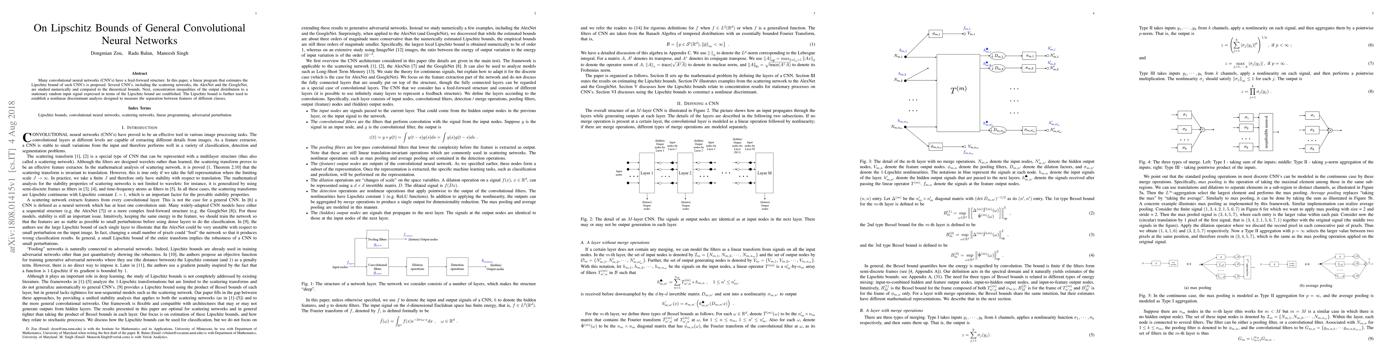 This paper proposes a linear program to estimate the Lipschitz bound of general convolutional neural networks (CNNs) and applies it to several CNN architectures. It also establishes concentration inequalities and uses the Lipschitz bound to develop a nonlinear discriminant analysis for class feature separation.