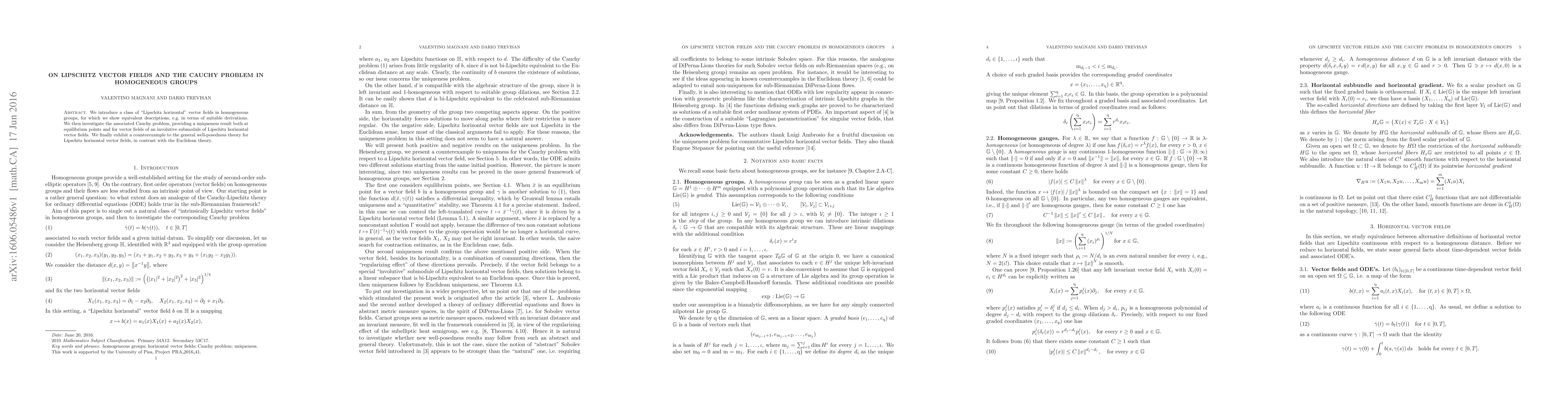 This paper introduces "Lipschitz horizontal" vector fields in homogeneous groups, proving their equivalence to suitable derivations and addressing the associated Cauchy problem, including uniqueness results. It also presents a counterexample showing that the well-posedness theory for these fields does not generalize from Euclidean to non-Euclidean settings.