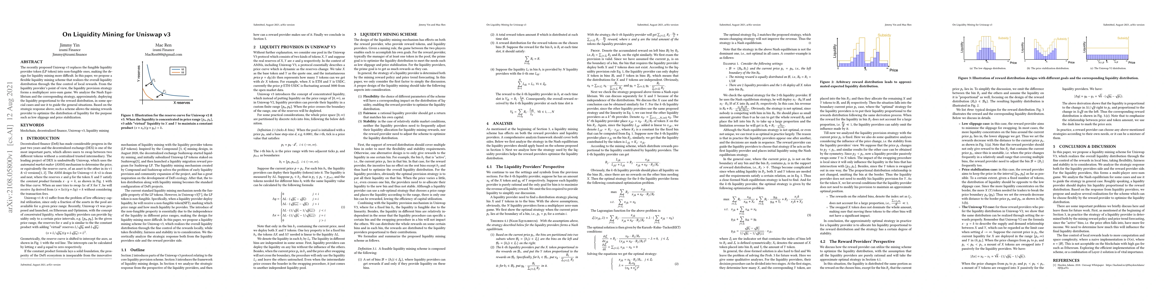 The paper proposes a liquidity mining scheme for Uniswap v3, analyzing the Nash Equilibrium for liquidity providers in a multiplayer zero-sum game context.