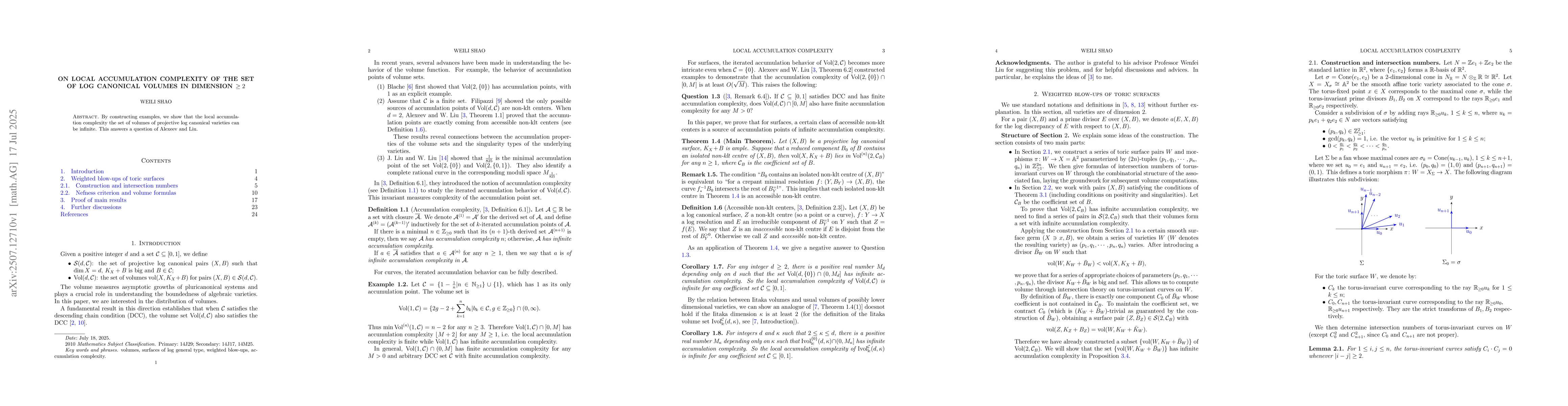 We prove that the local accumulation complexity of the set of log canonical volumes in dimension $\geq 2$ can be infinite.