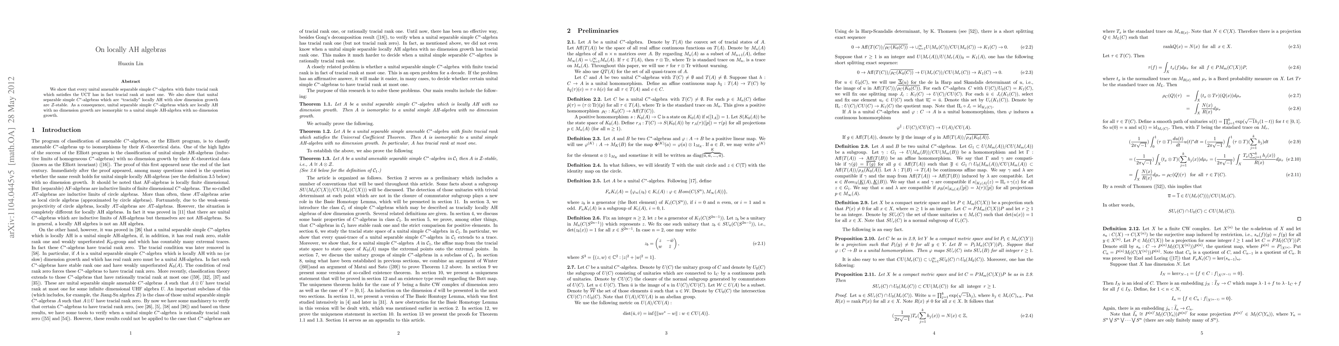 We show that every unital amenable separable simple $C^*$-algebra with finite tracial rank which satisfies the UCT has in fact tracial rank at most one. We also show that unital separable simple $C^*$-algebrass which are "tracially" locally AH with slow dimension growth are ${\cal Z}$-stable. As a consequence, unital separable simple $C^*$-algebras which are locally AH with no dimension growth are isomorphic to a unital simple AH-algebra with no dimension growth.