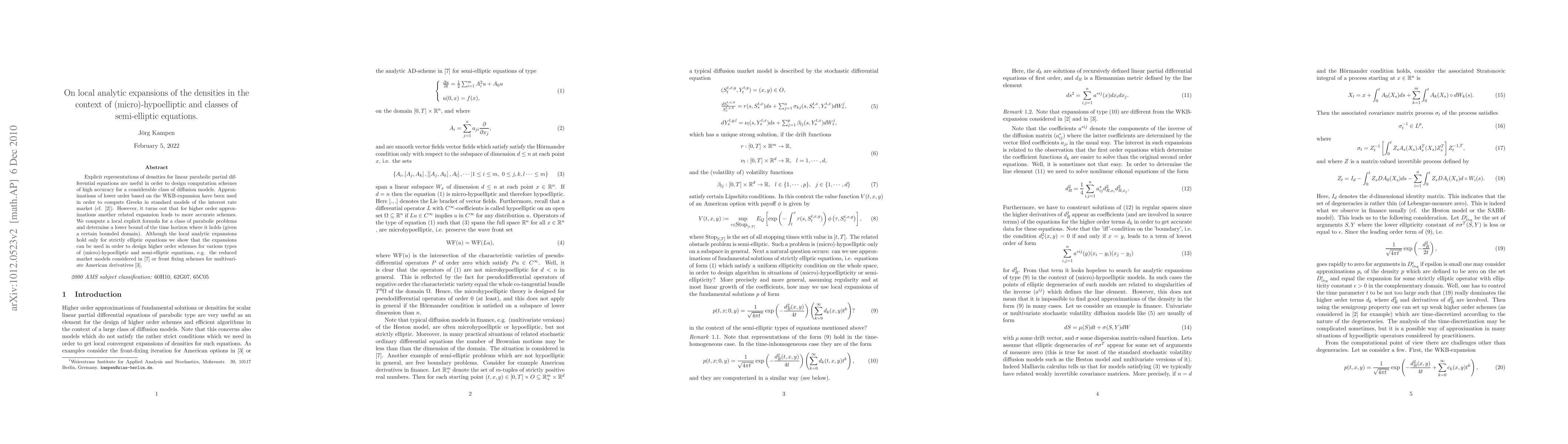 Explicit representations of densities for linear parabolic partial differential equations are useful in order to design computation schemes of high accuracy for a considerable class of diffusion models. Approximations of lower order based on the WKB-expansion have been used in order to compute Greeks in standard models of the interest rate market (cf. [2]). However, it turns out that for higher order approximations another related expansion leads to more accurate schemes. We compute a local explicit formula for a class of parabolic problems and determine a lower bound of the time horizon where it holds (given a certain bounded domain). Although the local analytic expansions hold only for strictly elliptic equations we show that the expansions can be used in order to design higher order schemes for various types of (micro)-hypoelliptic and semi-elliptic equations, e.g. the reduced market models considered in [7] or front fixing schemes for multivariate American derivatives [3].