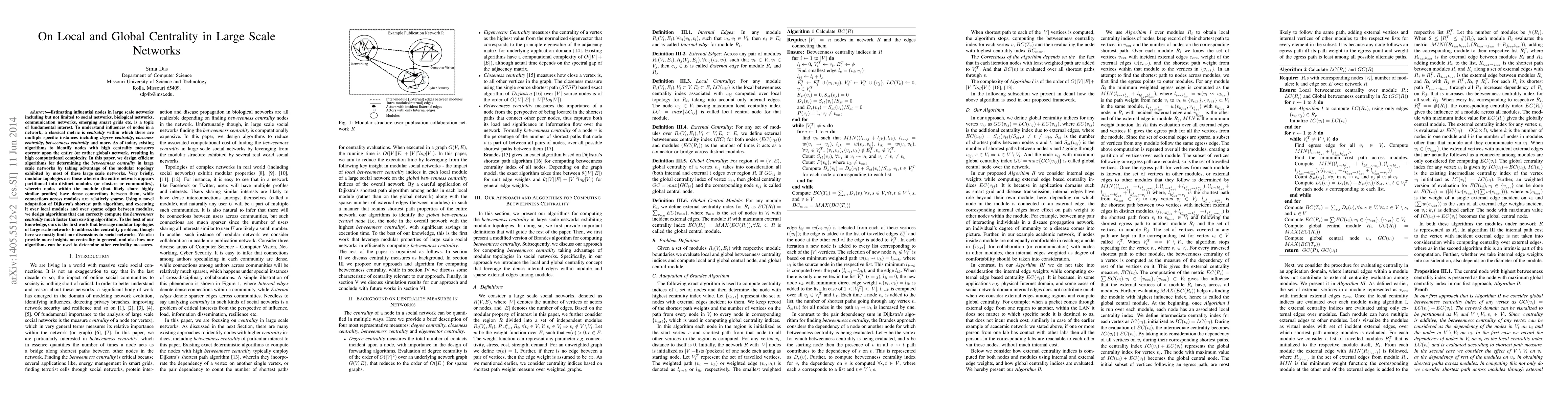Estimating influential nodes in large scale networks including but not limited to social networks, biological networks, communication networks, emerging smart grids etc. is a topic of fundamental interest. To understand influences of nodes in a network, a classical metric is centrality within which there are multiple specific instances including degree centrality, closeness centrality, betweenness centrality and more. As of today, existing algorithms to identify nodes with high centrality measures operate upon the entire (or rather global) network, resulting in high computational complexity. In this paper, we design efficient algorithms for determining the betweenness centrality in large scale networks by taking advantage of the modular topology exhibited by most of these large scale networks. Very briefly, modular topologies are those wherein the entire network appears partitioned into distinct modules (or clusters or communities), wherein nodes within the module (that likely share highly similar profiles) have dense connections between them, while connections across modules are relatively sparse. Using a novel adaptation of Dijkstra's shortest path algorithm, and executing it over local modules and over sparse edges between modules, we design algorithms that can correctly compute the betweenness centrality much faster than existing algorithms. To the best of our knowledge, ours is the first work that leverage modular topologies of large scale networks to address the centrality problem, though here we mostly limit our discussions to social networks. We also provide more insights on centrality in general, and also how our algorithms can be used to determine other centrality measures.