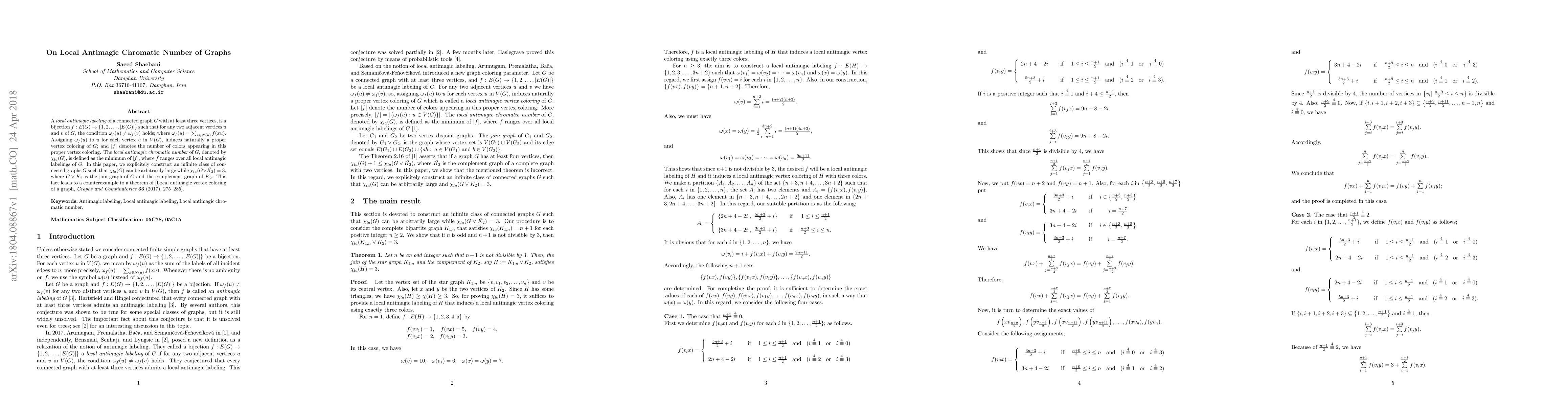 This paper explores the local antimagic chromatic number of graphs, defining it as the minimum number of colors in a proper vertex coloring induced by local antimagic labelings. It constructs an infinite class of graphs where this number can be arbitrarily large, while the join with the complement of a two-vertex graph results in a fixed chromatic number of 3, disproving a previous theorem.