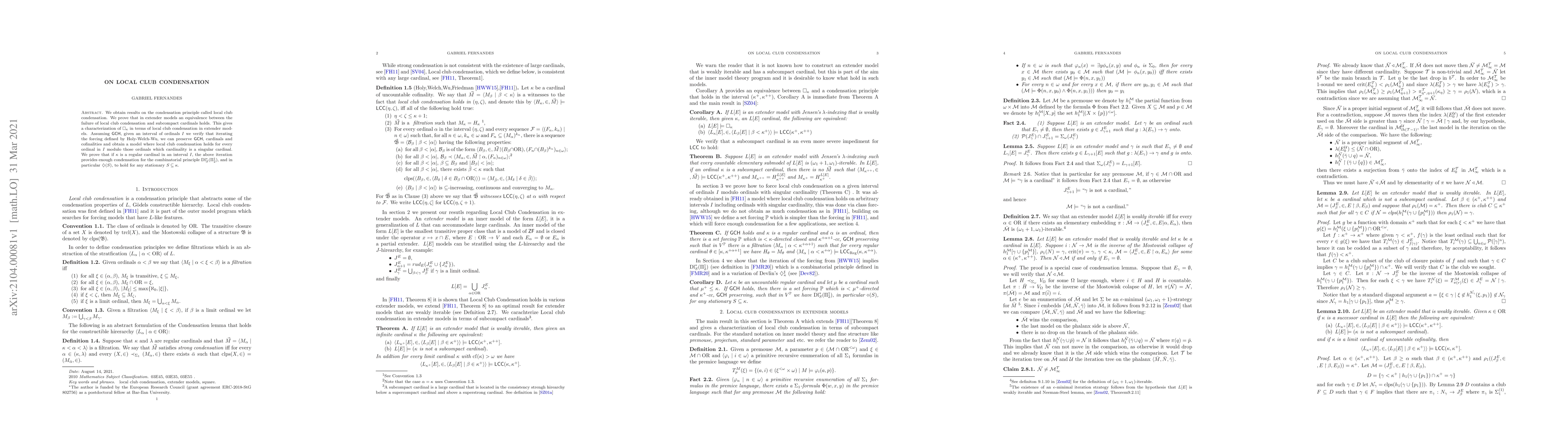 We obtain results on the condensation principle called local club condensation. We prove that in extender models an equivalence between the failure of local club condensation and subcompact cardinals holds. This gives a characterization of $\square_{\kappa}$ in terms of local club condensation in extender models. Assuming $\gch$, given an interval of ordinals $I$ we verify that iterating the forcing defined by Holy-Welch-Wu, we can preserve $\gch$, cardinals and cofinalities and obtain a model where local club condensation holds for every ordinal in $I$ modulo those ordinals which cardinality is a singular cardinal. We prove that if $\kappa$ is a regular cardinal in an interval $I$, the above iteration provides enough condensation for the combinatorial principle $\Dl_{S}^{*}(\Pi^{1}_{2})$, and in particular $\diamondsuit(S)$, to hold for any stationary $S \subseteq \kappa$.