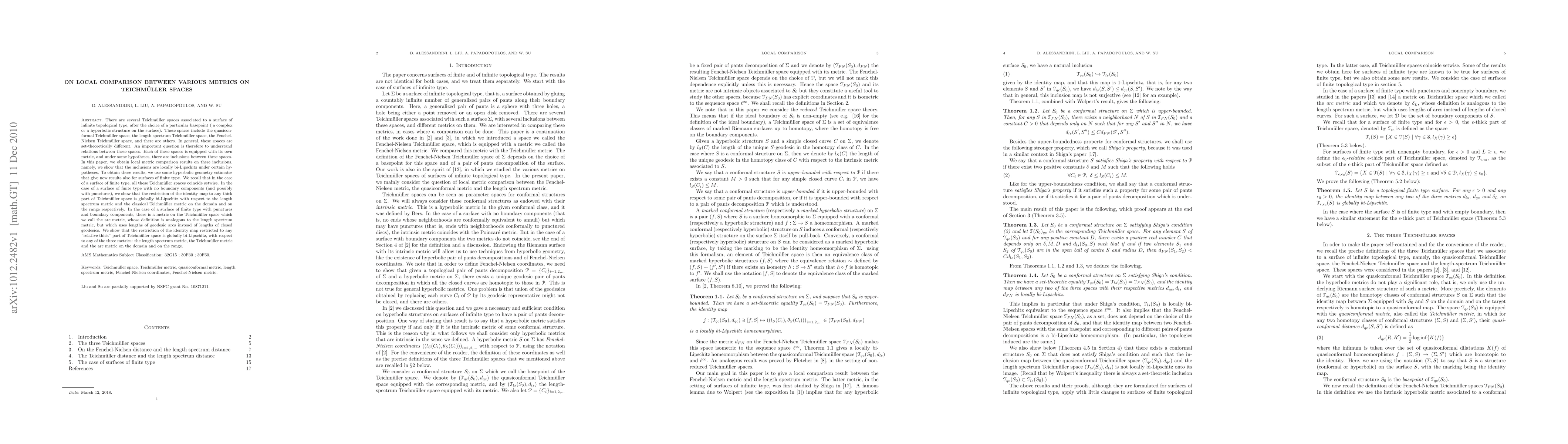 This paper explores local metric comparisons between various Teichmüller spaces associated with surfaces of infinite and finite topological types. It demonstrates that inclusions between these spaces are locally bi-Lipschitz under certain conditions, using hyperbolic geometry estimates and showing global bi-Lipschitz results for finite type surfaces, including the introduction of a new arc metric for surfaces with punctures and boundary components.