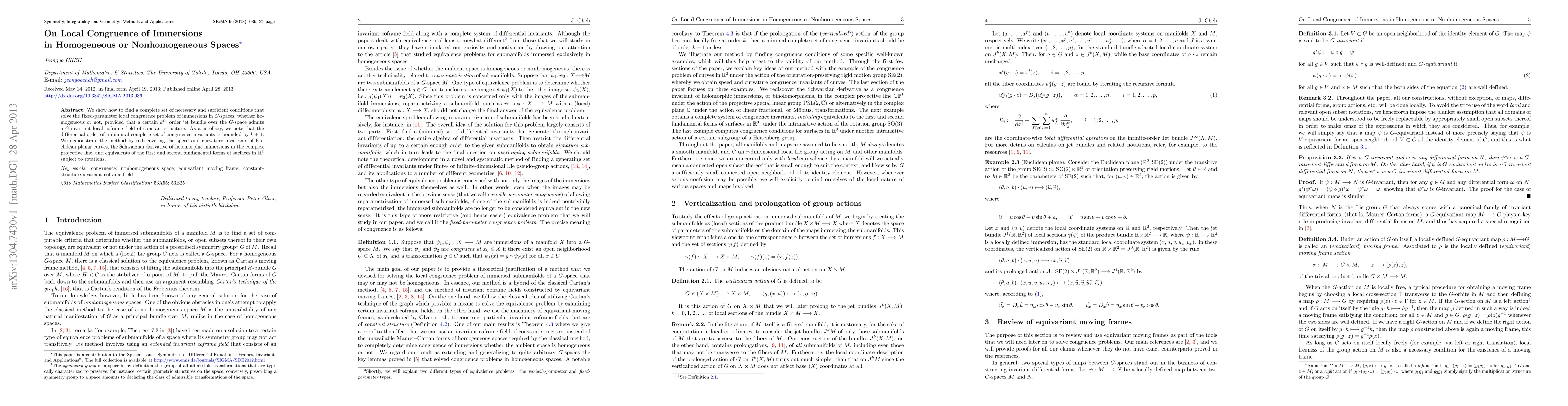 We show how to find a complete set of necessary and sufficient conditions that solve the fixed-parameter local congruence problem of immersions in $G$-spaces, whether homogeneous or not, provided that a certain $k^{\rm th}$ order jet bundle over the $G$-space admits a $G$-invariant local coframe field of constant structure. As a corollary, we note that the differential order of a minimal complete set of congruence invariants is bounded by $k+1$. We demonstrate the method by rediscovering the speed and curvature invariants of Euclidean planar curves, the Schwarzian derivative of holomorphic immersions in the complex projective line, and equivalents of the first and second fundamental forms of surfaces in ${\mathbb R}^3$ subject to rotations