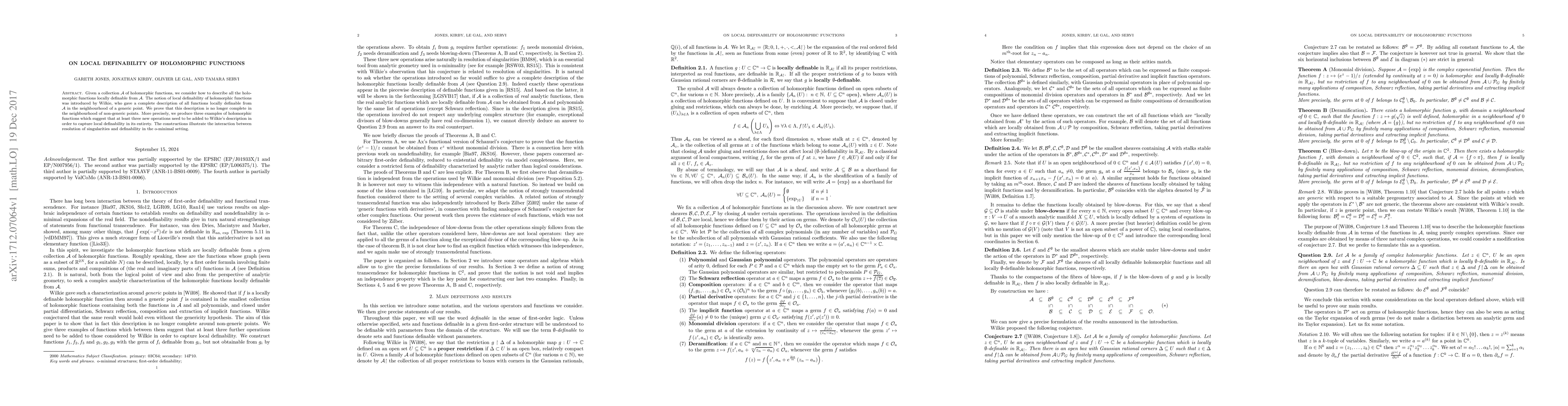 This paper explores the local definability of holomorphic functions using a given collection A, finding that Wilkie's complete description is insufficient near non-generic points. It presents three examples indicating the need for additional operations to fully capture local definability, highlighting the interplay between resolution of singularities and o-minimal definability.